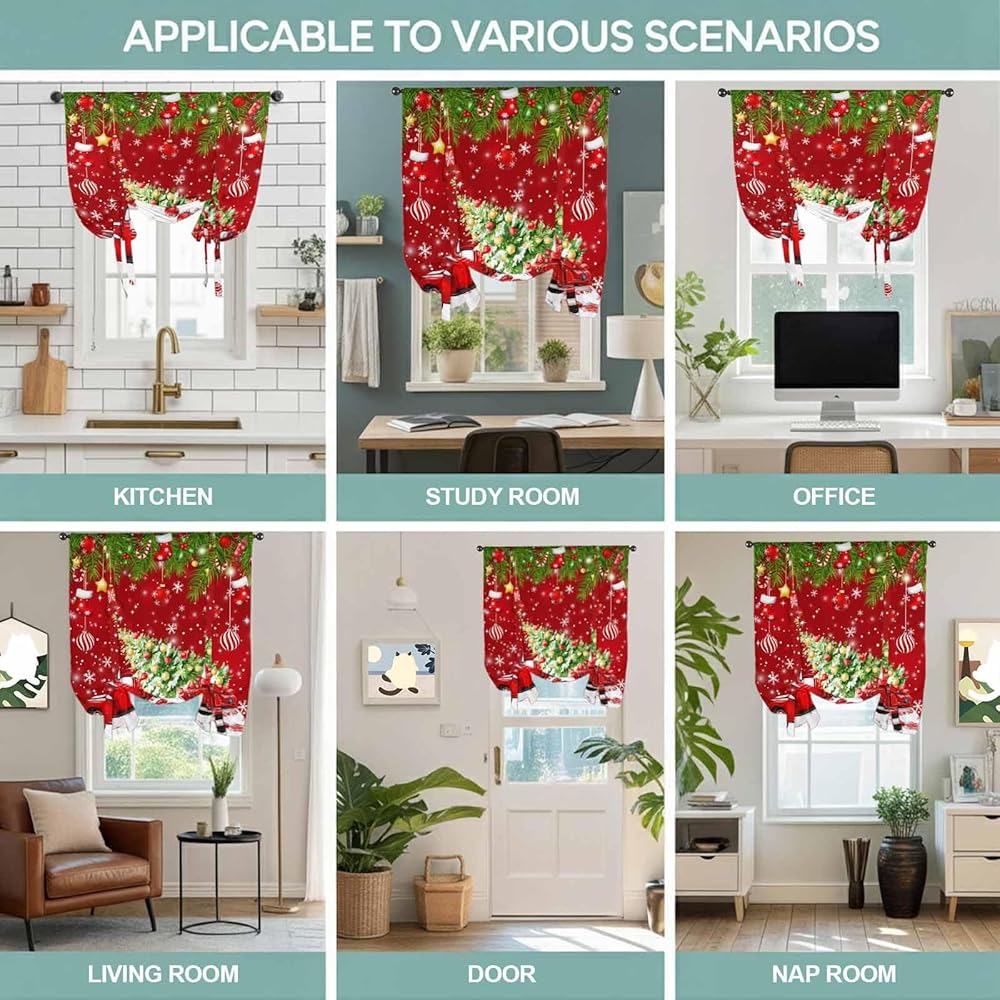 Red Christmas Tie Up Curtains for Window, Truck Pine Trees Branches Balls Snowflakes Thermal Insulated Balloon Shade Adjustable Rod Pocket Curtains Valance Panels for Kitchen Bathroom Café 42'' x 63''