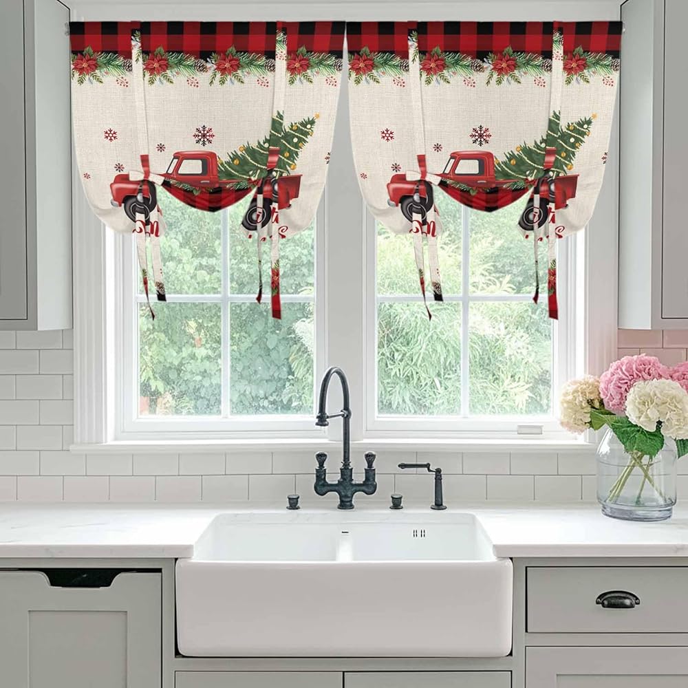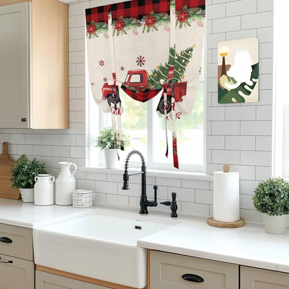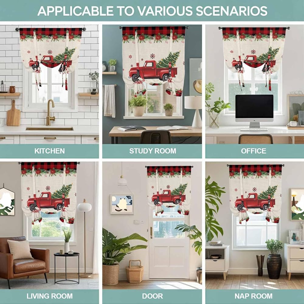 Christmas Truck Tie Up Curtains for Window, Red Black Plaid Xmas Tree Snowflake Burlap Thermal Balloon Shade Adjustable Rod Pocket Curtains Valance Panels for Kitchen Bathroom Café 52'' x 63''