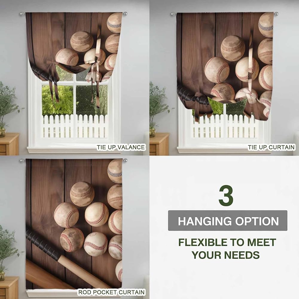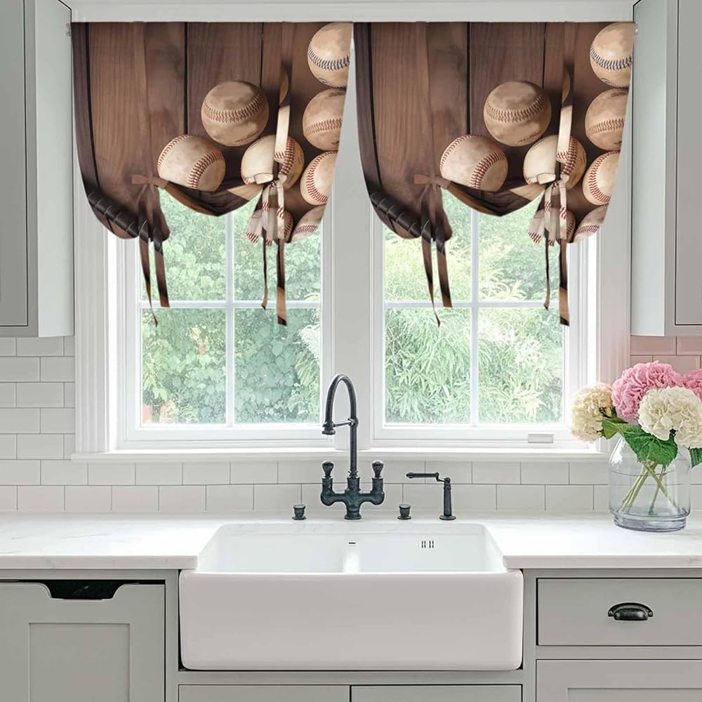 Baseball Tie Up Curtains for Window, Farmhouse Retro Sport Theme Brown Wooden Grain Thermal Insulated Balloon Shade Adjustable Rod Pocket Curtains Valance Panels for Kitchen Bathroom Café 42'' x 63''
