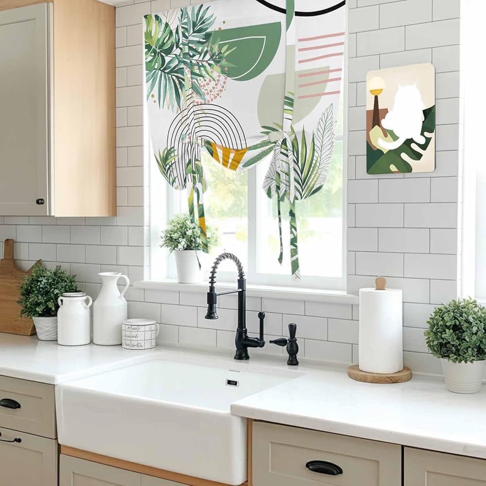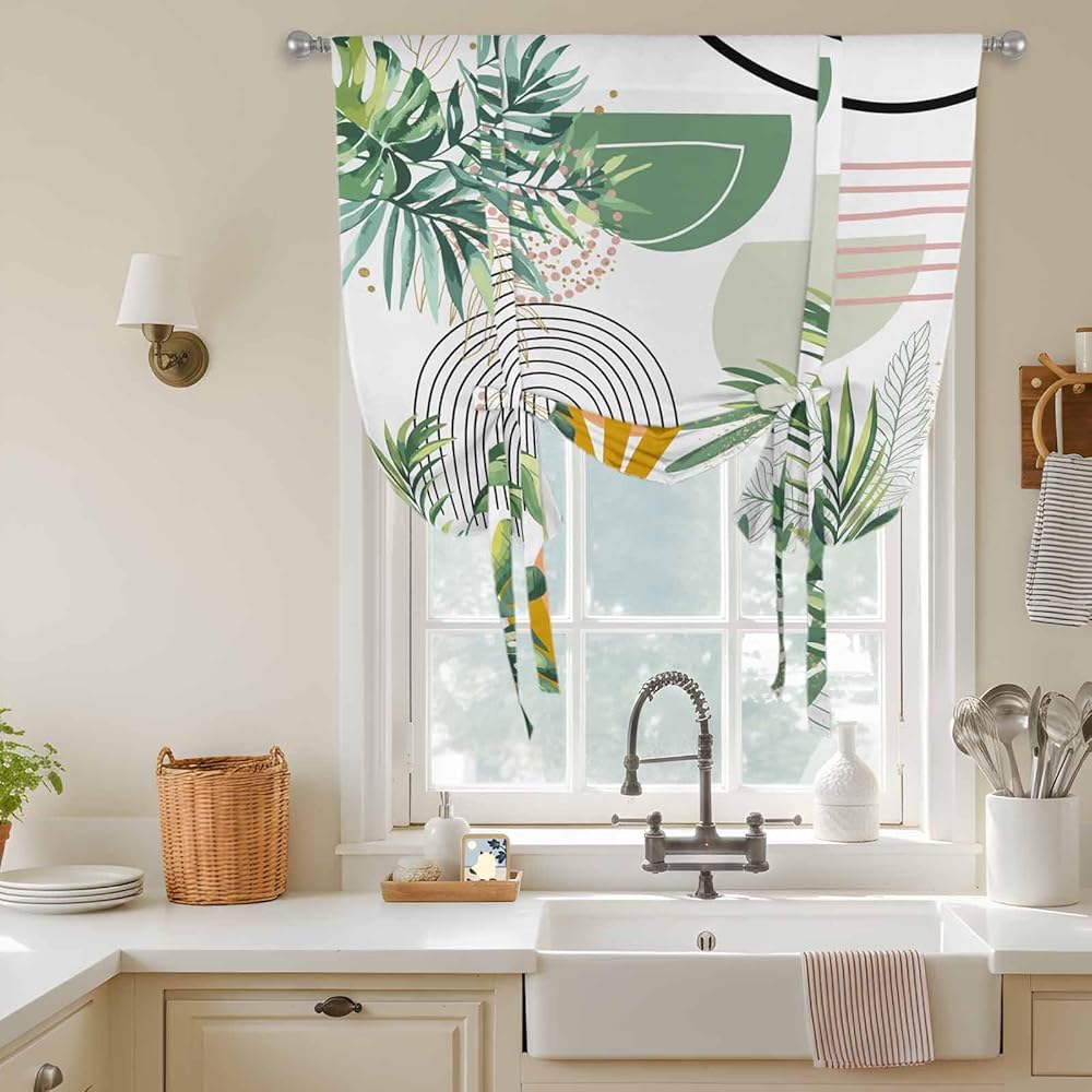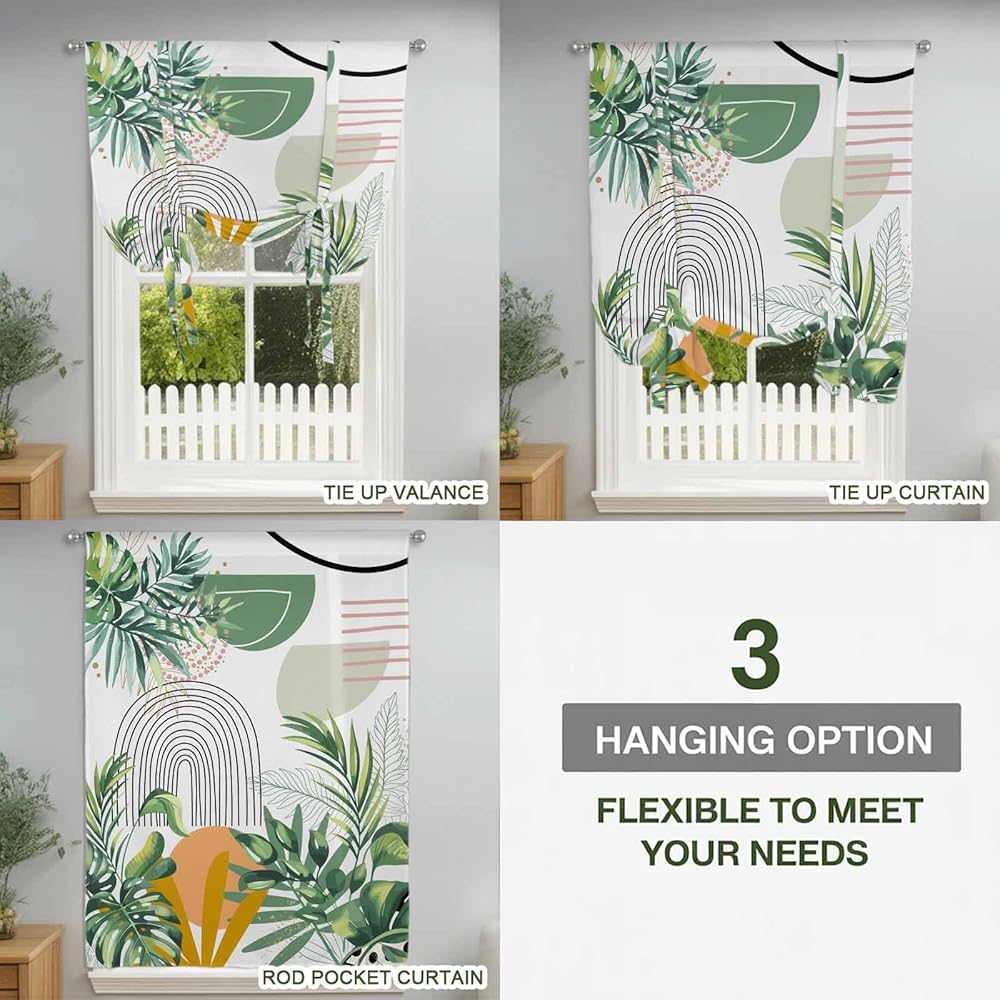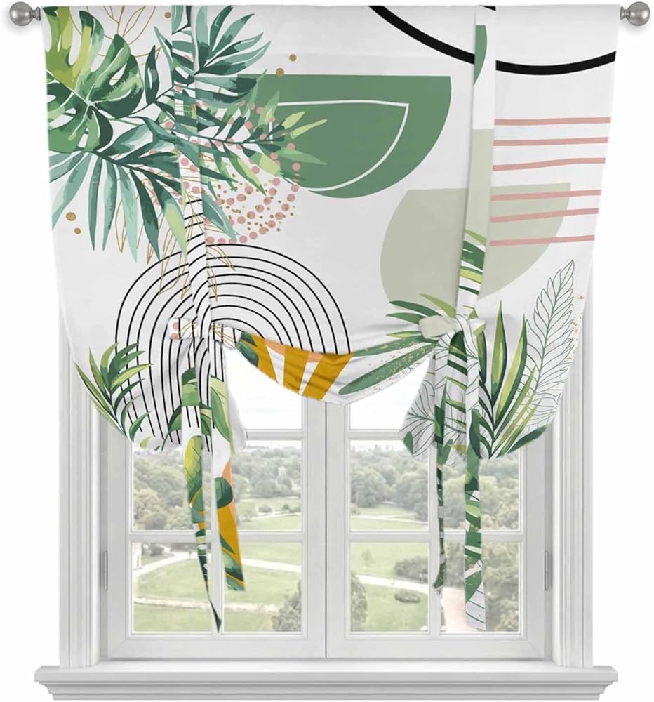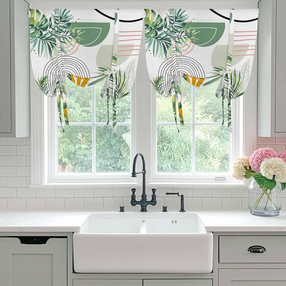 Tropical Summer Tie Up Curtains for Window, Boho Palm Leaves Botanical Watercolor Thermal Insulated Balloon Shade Adjustable Rod Pocket Curtains Valance Panels for Kitchen Bathroom Café 34'' x 45''