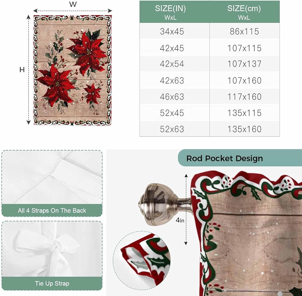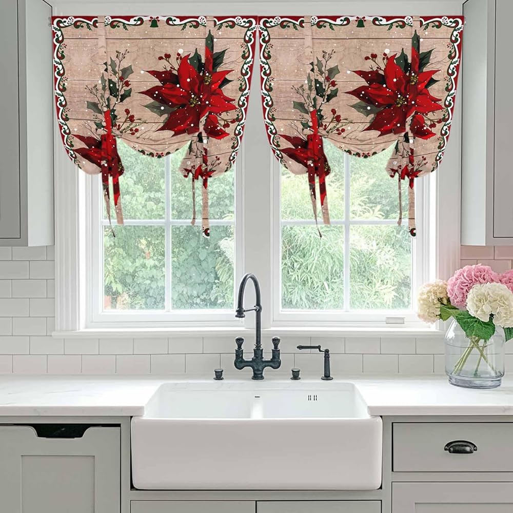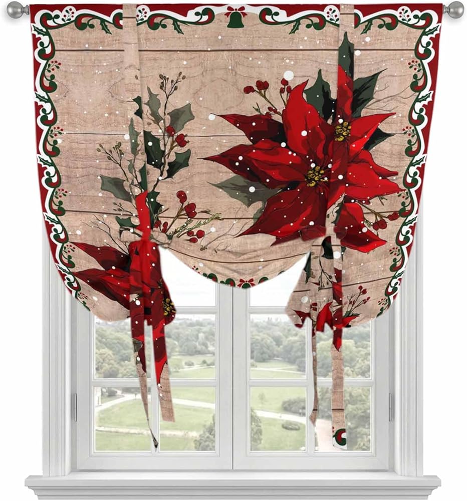 Christmas Poinsettia Tie Up Curtains for Window, Winter Xmas Red Floral Botanical Wooden Thermal Balloon Shade Adjustable Rod Pocket Curtains Valance Panels for Kitchen Bathroom Café 34'' x 45''