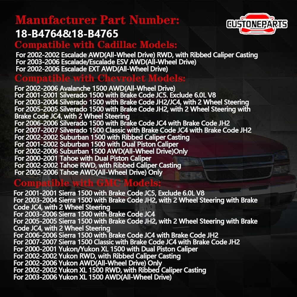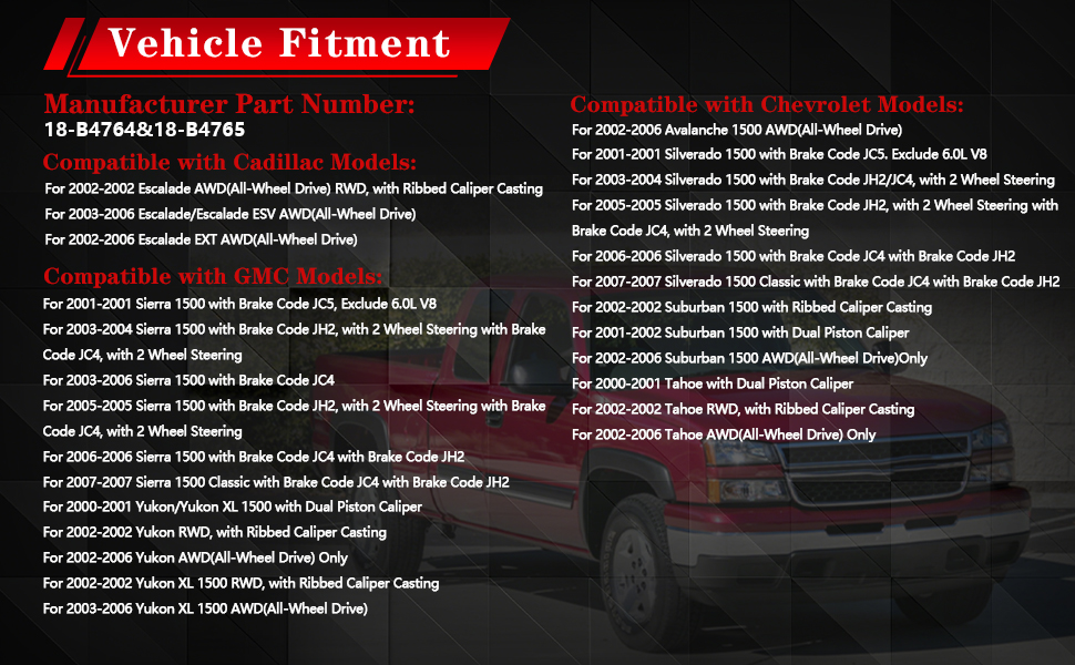FIT 2001-2007 Chevrolet Silverado 1500, Tahoe, Suburban, Avalanche 1500; FIT 2001-2007 GMC Sierra 1500, Yukon, Yukon XL 1500; FIT 2002-2006 Cadillac Escalade; FIT 1999-2003 Ford F-150. Specifically for vehicles equipped with rear disc brake systems.