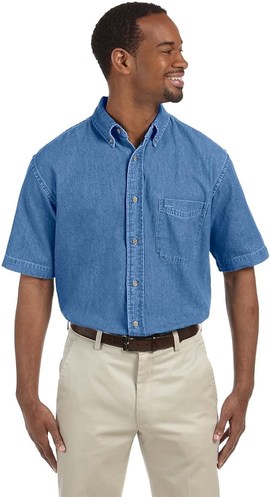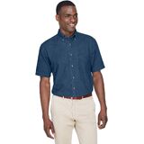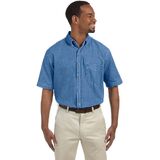 100% cotton denim Flat-felled seams Khaki double-needle topstitching Signature twill tape at neck Fully constructed front placket Signature horn-style buttons with Harriton logo and contrast thread Button-down collar Left-chest pocket