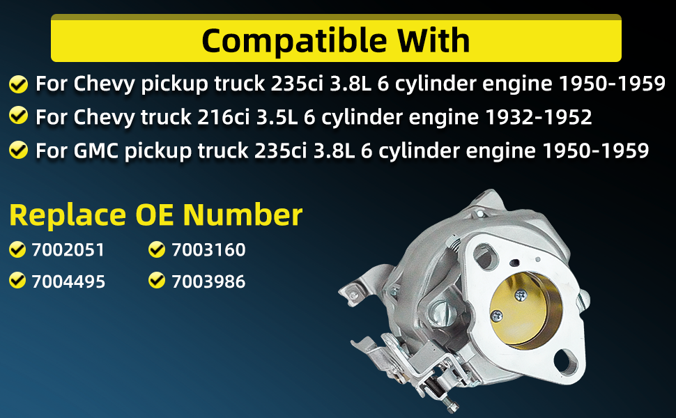 • متوافق مع: 7002051 مكربن لشاحنة تشيفي بيك اب 235 ci 3.8L محرك 6 أسطوانات 1950-1959، لشاحنة تشيفي 216 ci 3.5L محرك 6 أسطوانات 1932-1952، لشاحنة GM GMC بيك اب 235ci 3.8L محرك 6 أسطوانات 1950-1959، لشاحنة تشيفي 3100 235 ci محرك 6 أسطوانات 1954-1959