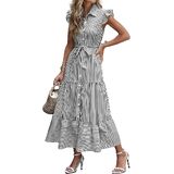 Design - This maxi dress for women adorned with ruffle cap sleeve,summer long dress,pockets,striped plaid,tie waist,tiered,simple but fashion, comfortable to wear.Dresses for women/Womens dresses/Long dresses for women/Maxi dress/Maxi dresses for women/Button down dress/Plaid dresses for women/Striped dress/Sleeveless dress for women/Shirt dress for women