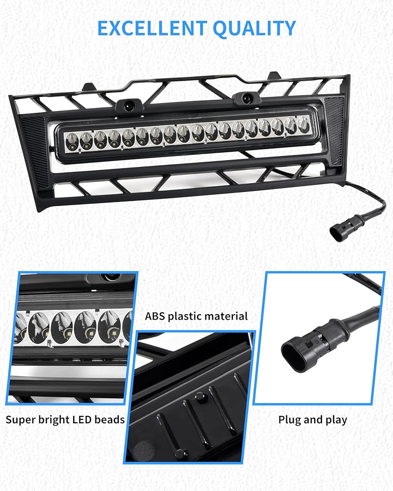 The Front Grille with LED Light Bar is equipped with 18 high-brightness and energy-efficient LED beads that adapt to a variety of driving conditions, providing superior illumination for nighttime driving or off-road adventures; the adjustable light angle allows you to customize the direction of illumination to suit your needs.