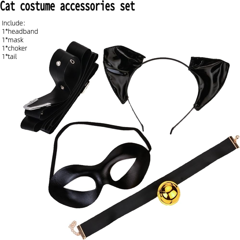 Transform into a mysterious feline with this complete Black Cat Costume Accessories Set. This versatile collection includes everything you need for the purr-fect costume: sleek black cat ears on an adjustable headband, an elegant half-mask for that masquerade look, a sophisticated black choker with a golden bell accent, and a matching black tail. Crafted from high-quality synthetic leather, each piece is designed for comfort and adjustability to fit most adults. The set features durable construction with attention to detail, from the shiny finish on the ears to the eye-catching golden bell. Perfect for Halloween parties, cosplay events, or any costume occasion where you want to channel your inner feline charm. The accessories are easy to put on and adjust for the perfect fit, making this set ideal for quick costume changes. Hand wash only to maintain quality. One size fits most adults. The compact packaging measures 7.8 x 7.8 x 1.1 inches, making it convenient for storage and transport. Add this essential costume set to your collection for endless opportunities to embrace your playful side.
