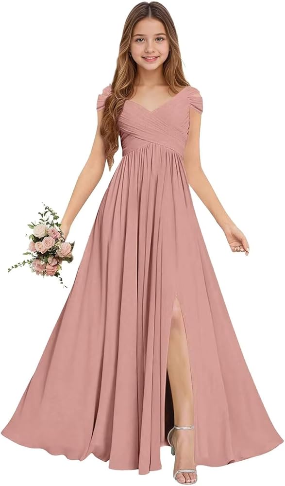Style: This chiffon girls birdesmaid dresses has off shoulder,v neck,slit,zipper back for a better fit to this girls fancy dress.your little girl will be excited about this gorgeous princess dress.long chiffon junior bridesmaid dresses,off shoulder girls formal evening dress,v neck chiffon girls wedding guest dress,chiffon girls prom dress for teens.