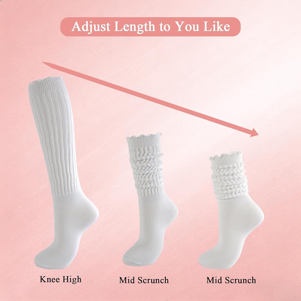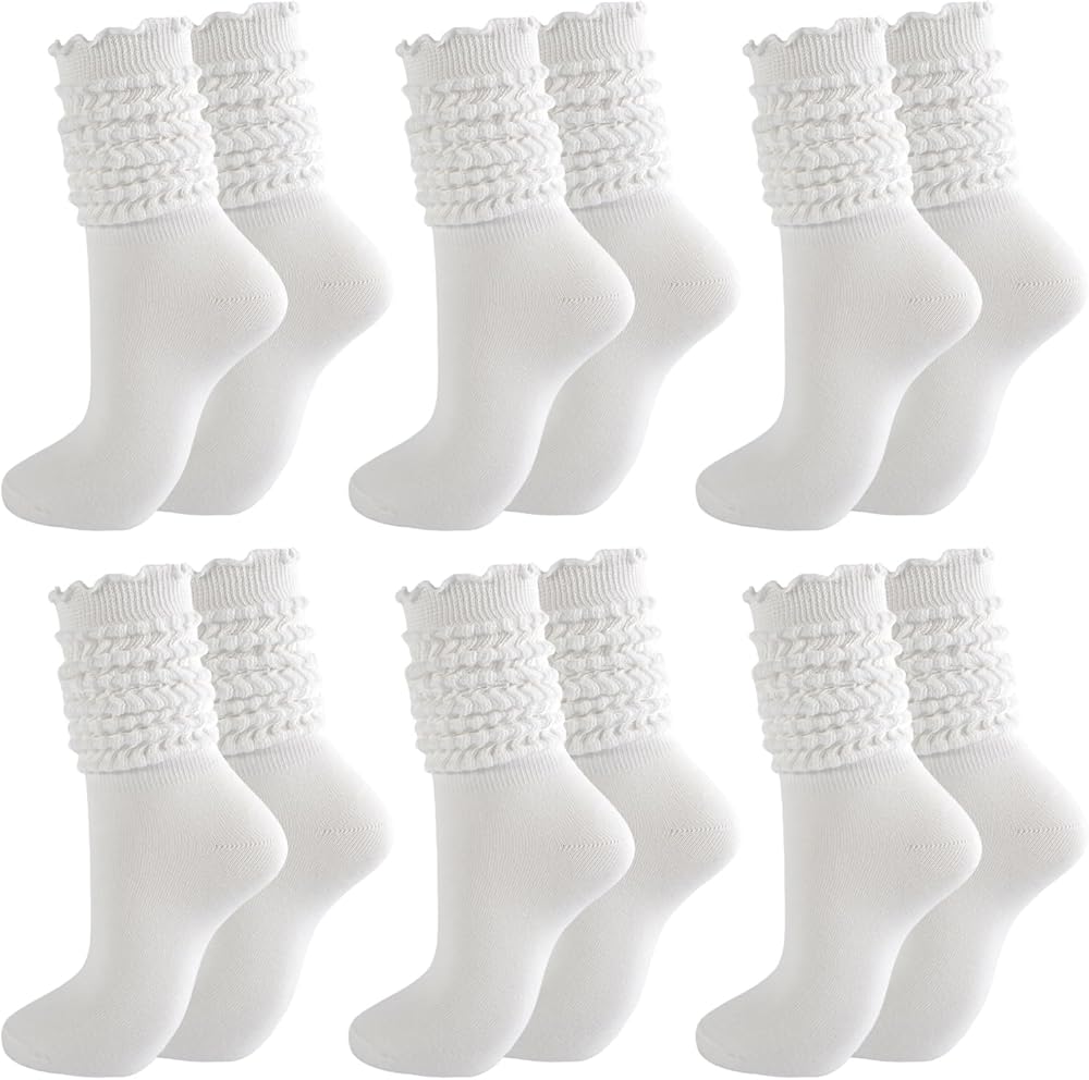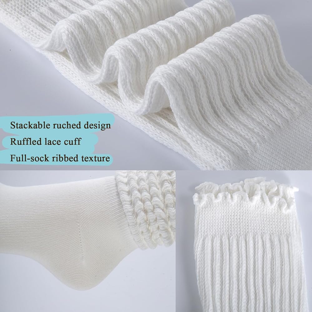 These 6-pair white womens ruffle socks blend comfort and fashion, crafted from 80% polyester cotton, 16% polyamide, 4% elastic for ultra-soft texture and flexible fit (US 9-11, one size fits most). Ruffle trim, scrunch design, and slouch silhouette complement boots, sneakers, or casual outfits with trendy flair. Versatile for errands, yoga, or dressy nights, these scrunchy socks for women are reliable ruffle boot socks that pair perfectly with all footwear. Breathable moisture-wicking fabric keeps feet cool dry, with customizable wear as knee-highs, scrunched, or rolled. This 6-pack womens ruffle socks is a durable, fashion-forward wardrobe essential, blending luxury and practicality for long-lasting all-day softness. These slouchy socks for women add feminine flair to casual or boot ensembles, ideal for style and comfort seekers.