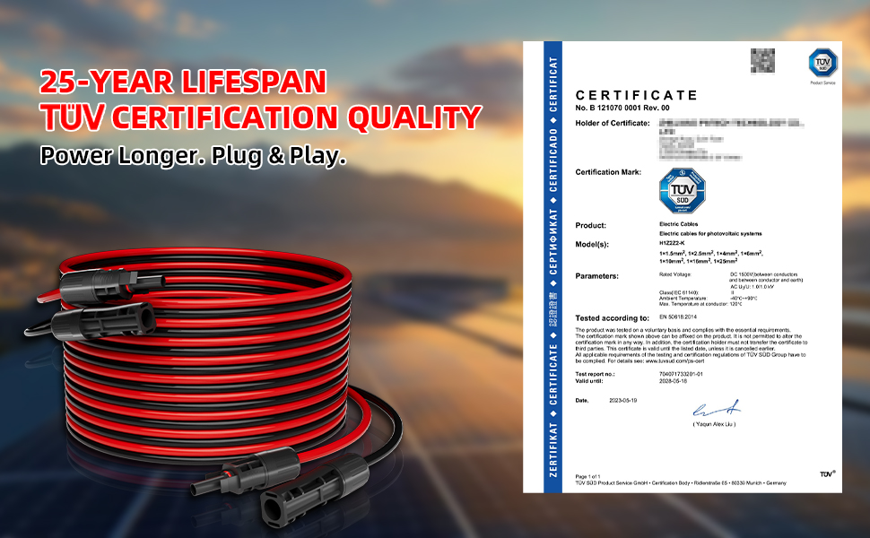 🔅[25-Year Ultra-Long Lifespan] Engineered for longevity, this PV wire is TUV Certified (EN50618:2014) to ensure maximum safety and reliability. Built to withstand extreme environments, our solar extension cable operates flawlessly in temperatures ranging from -40°F to 194°F. Invest once in a professional-grade solar cable that is guaranteed to power your system for over two decades without degradation.