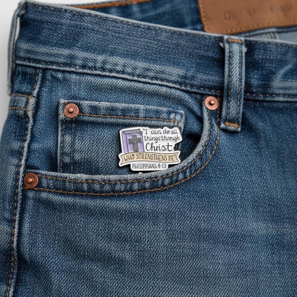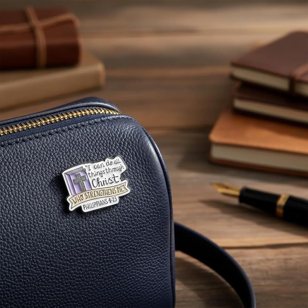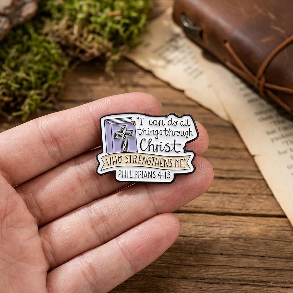 Wear Your Source of Strength:Carry a powerful reminder of faith with you always. This beautiful pin features the uplifting scripture from Bible, "I can do all things through Christ who strengthens me," serving as a source of daily encouragement and hope.
