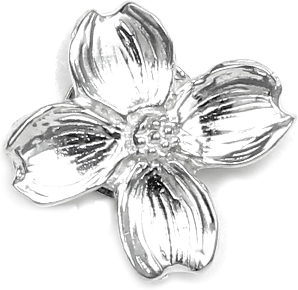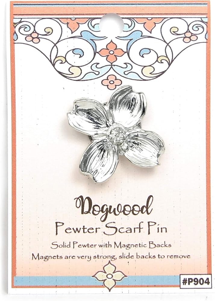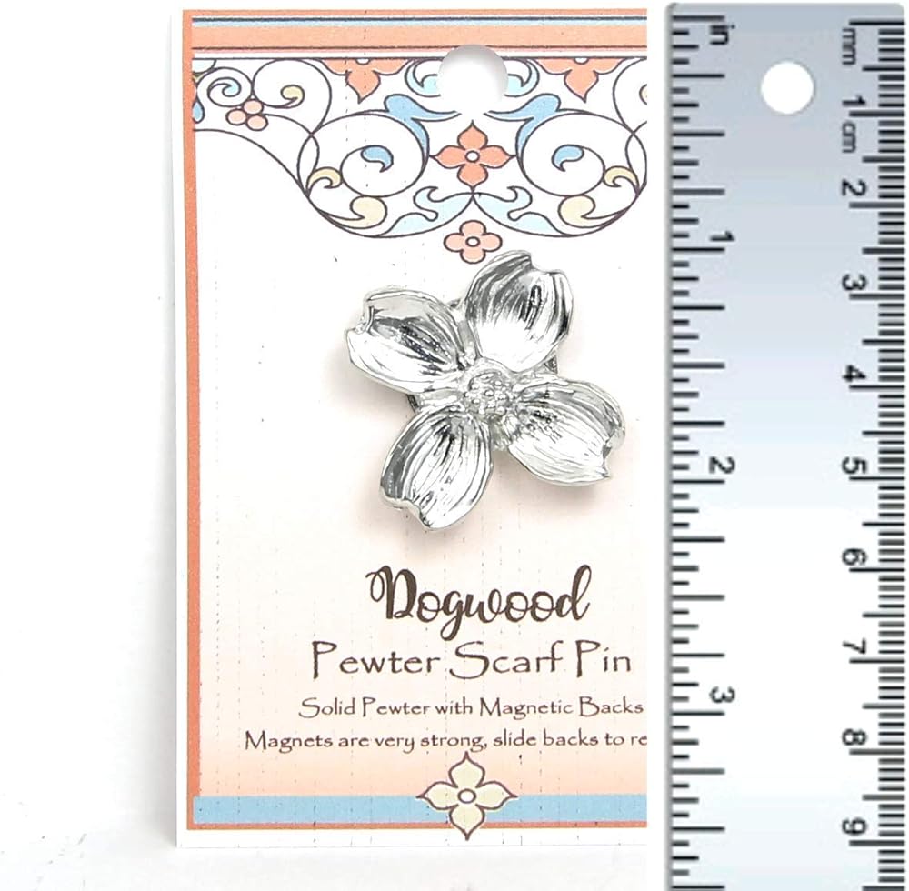 Handcrafted pewter Dogwood Flower front with a magnetic back closure. Decorative and useful to keep scarf in place without putting holes in clothes. Magnets are strong but not intended to be used as fasteners.