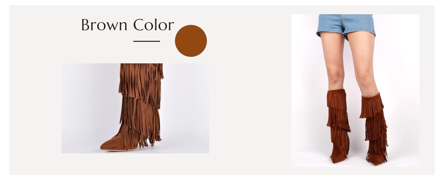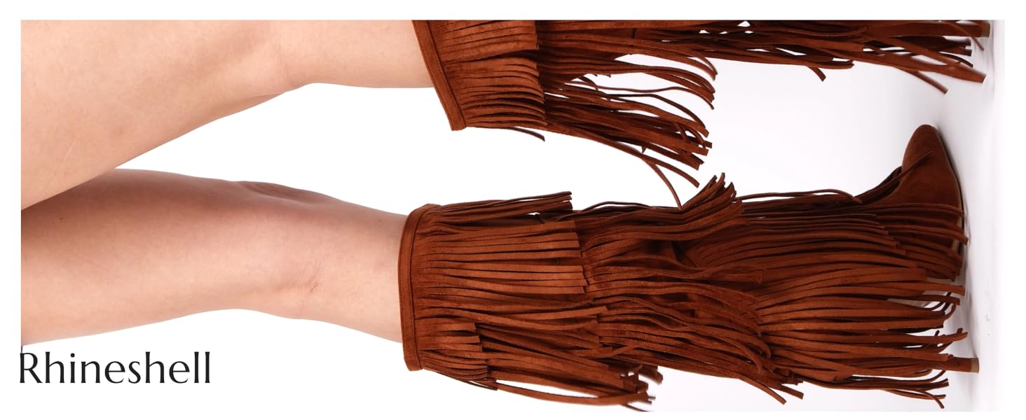 - Pointed closed toe, fringed, pull-on, thin high heels, faux suede long boots
