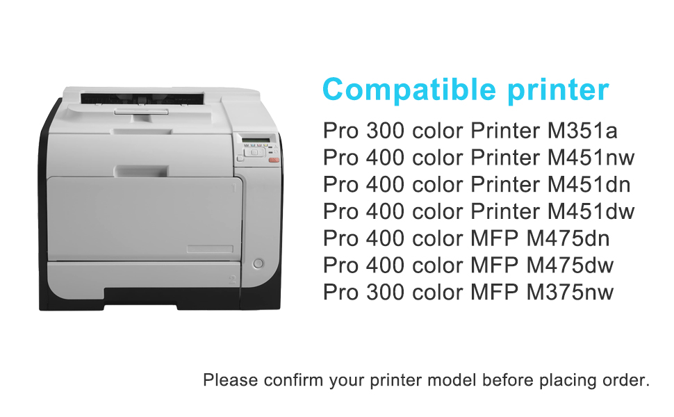 This cartridge works with: Pro 300 Color Printer M351a, M451nw, M451dn, M451dw, Pro 400 Color MFP M475dn, M475dw, Pro 300 Color MFP M375nw Printer
