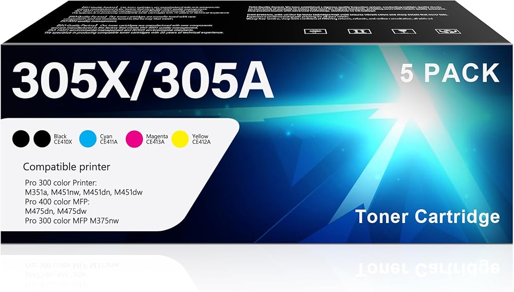 Included: 2 x 305X black toner (CE410X), 1 x 305A cyan toner (CE411A), 1 x 305A magenta toner (CE413A), 1 x 305A yellow toner (CE412A)