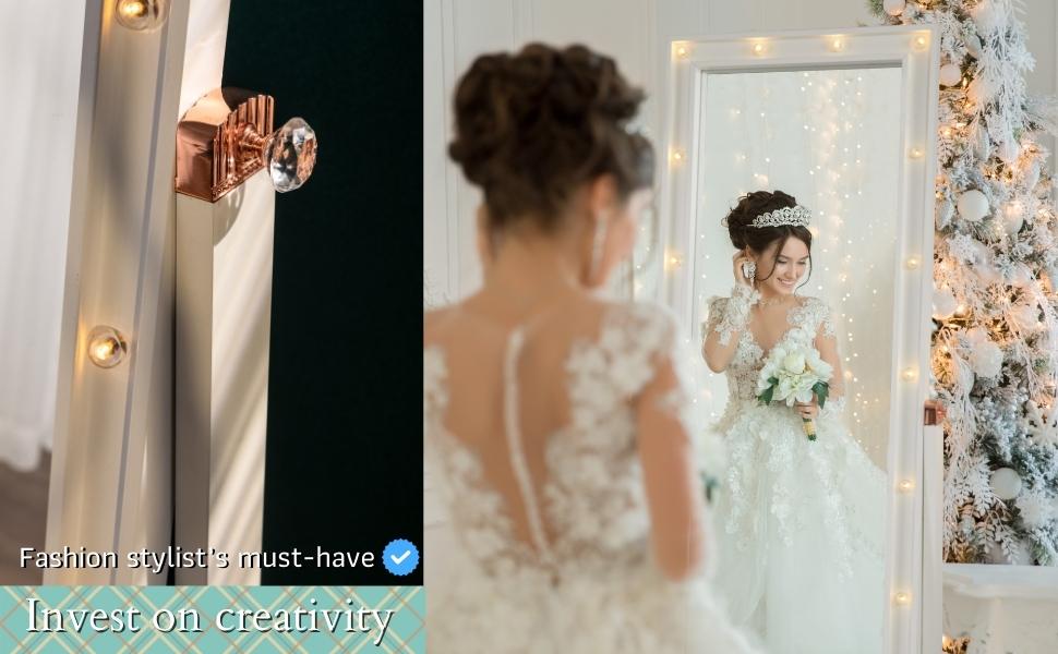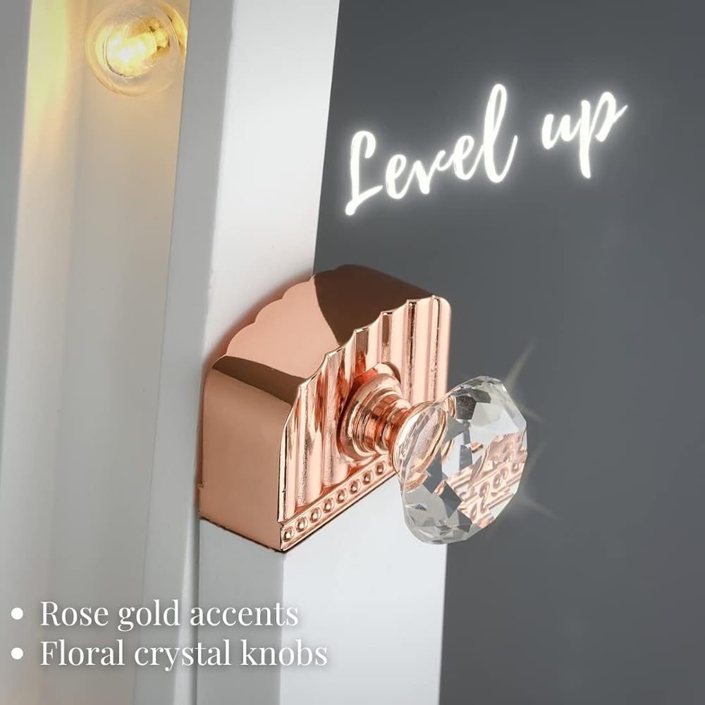𝐃𝐄𝐋𝐔𝐗𝐄 𝐀𝐂𝐂𝐄𝐍𝐓𝐒- Enhance your vanity area with premium rose gold accents that will captivate your senses. and handmade glass crystal knobs. Show your elegant side with handmade glass crystal knobs that keep the antique mirror in place