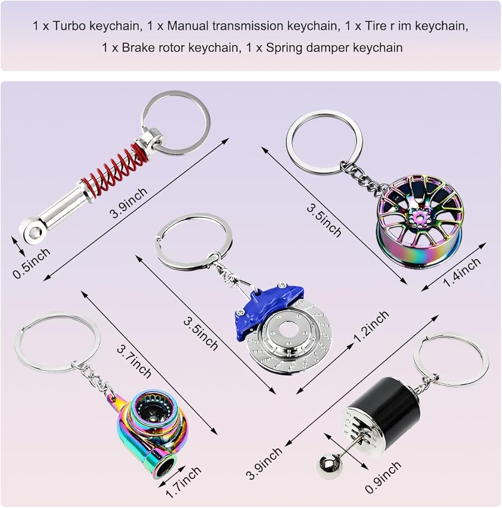 Complete Set: The package includes five detailed keychains. There is 1 Turbocharger Keychain, 1 Manual Transmission Keychain, 1 Tire Rim Keychain, 1 Brake Rotor Keychain and 1 Spring Damper Keychain.This variety offers plenty of options for personal use