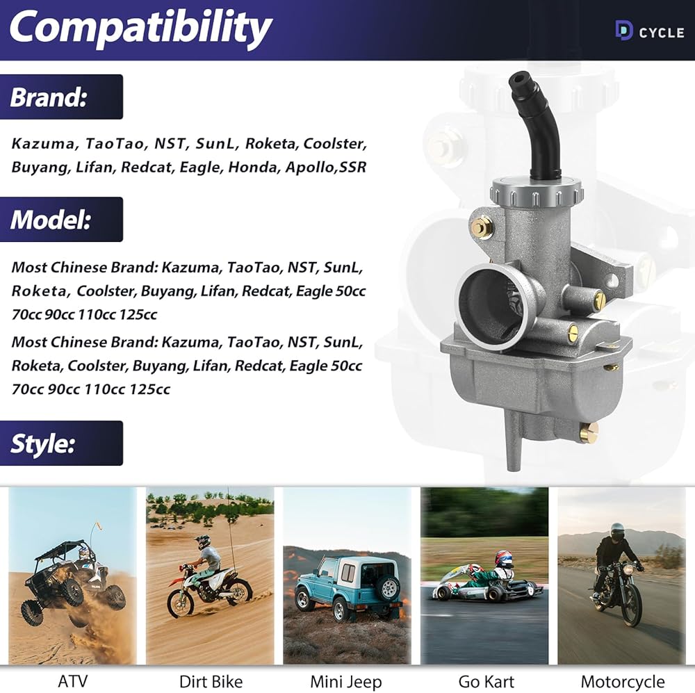 PZ20 Carburetor Kit for Tao tao Coolster 125cc 110cc 90cc 70cc 50cc Kazuma Baja Chinese ATV Quad 4 Wheeler SunL NST Roketa Loncin Lifan XR80 CRF70 4 Stroke Go Kart Pit Dirt Bike Parts