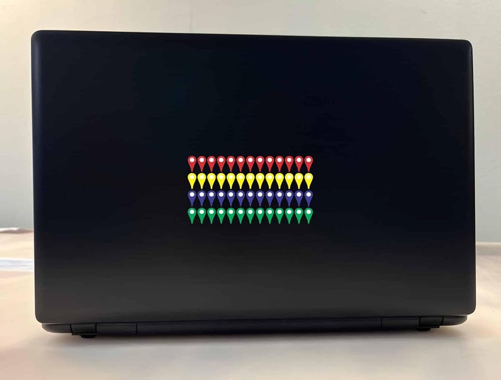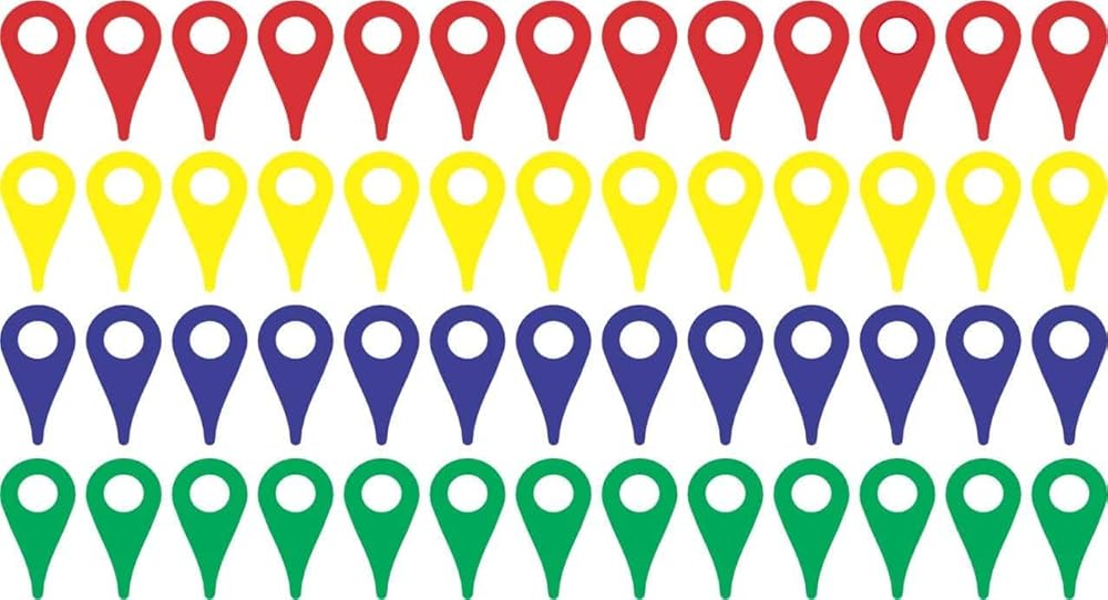 This product includes a sheet of 52 stickers, each sticker measuring approximately .25 inches wide by 0.5 inches tall when applied. The stickers are a variety of basic colors, all with a white circle in the middle of the thick top of the tapered pointer. There are 13 red stickers, 13 yellow stickers, 13 blue stickers, and 13 green stickers. These quality-made products are specially designed for use on maps and globes, making our map pointers the traveler's new best friend!