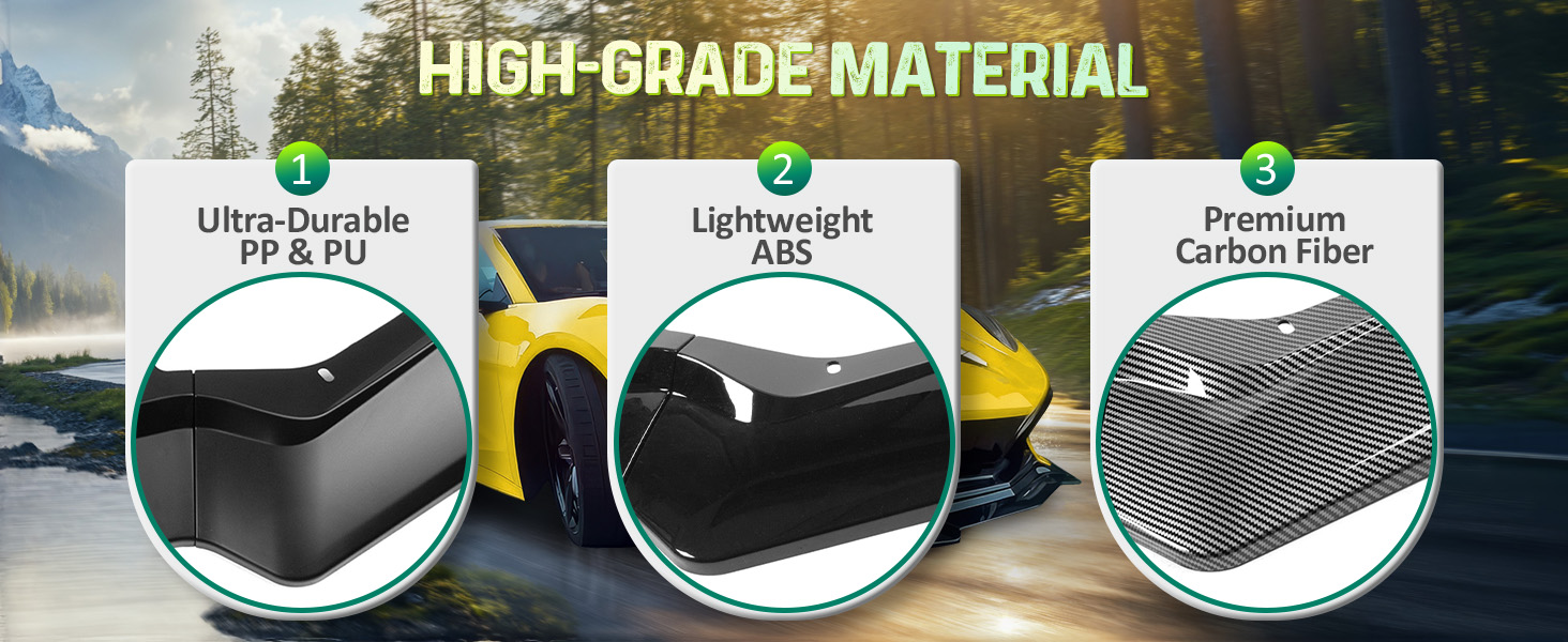 Premium-Grade Material: Our durable Polyurethane material front spoiler splitter can withstand harsh weathers and absorb impacts, resisting cracks from curbs, road debris, and minor collisions while maintaining perfect shape. The finish can undergoes rigorous UV exposure and weather conditions