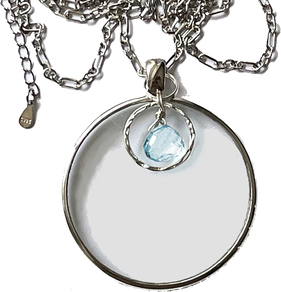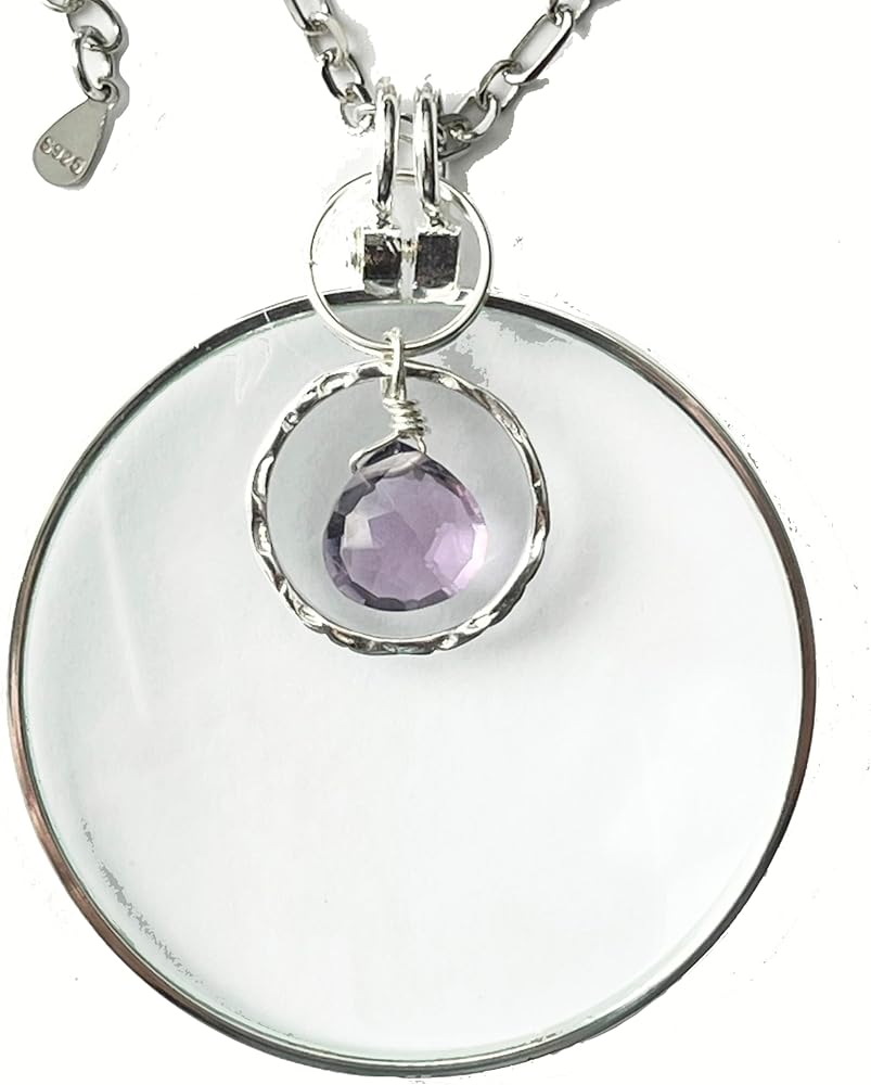 Increase your vision and your vibrational frequency! Aquamarine and Amethyst crystals have been revered since ancient times. Aquamarine is revered for magnifying the strength and serenity of the sea. This lovely waterdrop crystal is translucent with a tiny hint of blue. Amethyst crystal is revered for magnifying intuition and creatiivity. The light purple color is associated with the third eye. Both make a fashionable, functional and fascinating gift for oneself or a loved one. A real magnifier disguised as a beautiful piece of sterling silver jewelry.