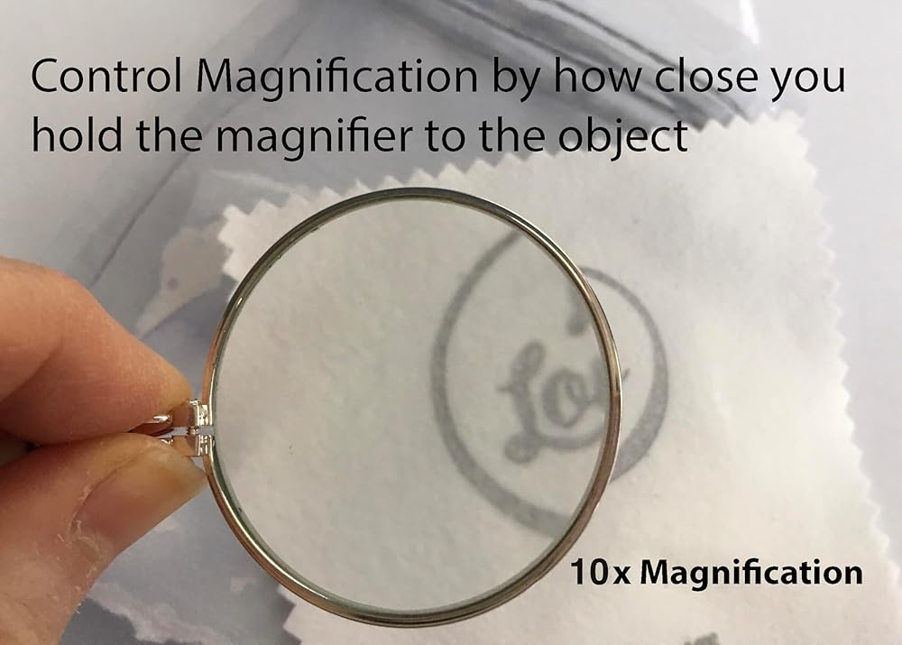 Magnifier is 1.75 inches in diameter. Magnification is 10X and you control the magnification by how close you hold the magnifier to the object.