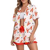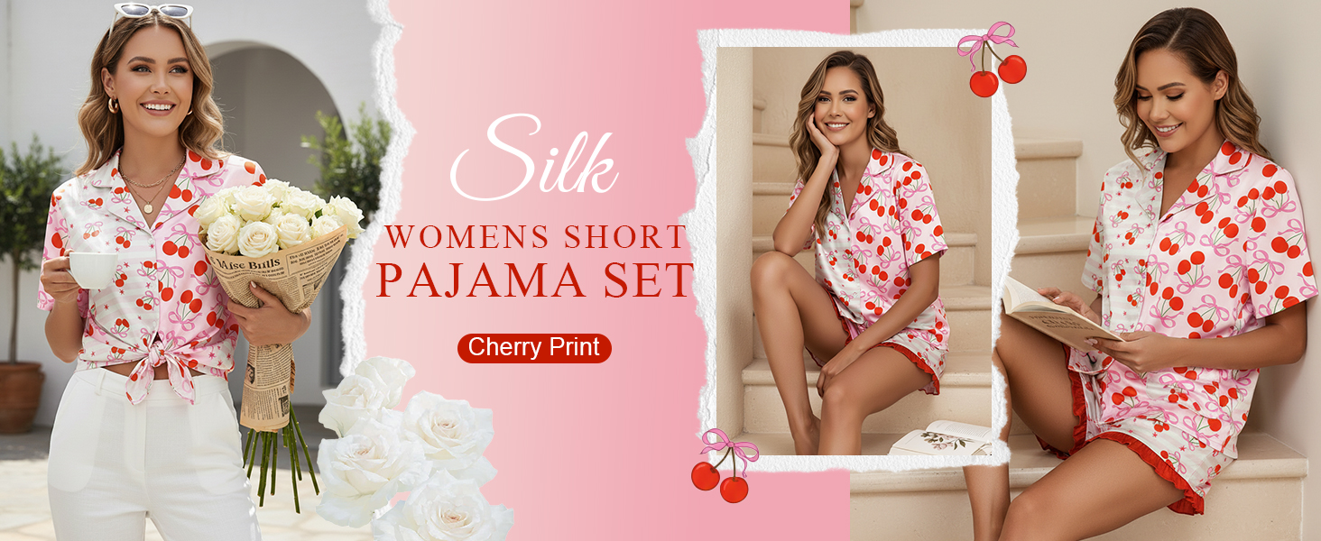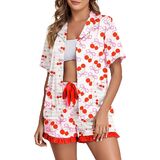 Short sleeve blue silk pajamas for women/ cute pink summer satin pajama set for women/ yellow button up pajama sets for women shorts/ pj sets for women 2 piece shorts/ red cherry 2 piece pajama set for women/ red womens pajama sets button down/ shorts pajama set for women/ summer sleepwear for women/ fruit print soft silky pajama set for women