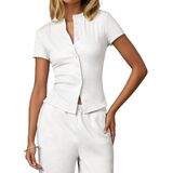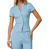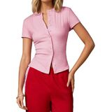 Women elegant crew neck button down knit cardigans aesthetic retro casual pink short sleeve button front slim fitted sweater shirt girls fairy coquette cute round neck skinny button up pullover jumper tops casual open front old money style cardigans sweater Summer split hem button tee top chic outfits