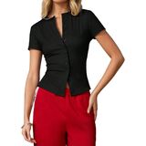 Short Sleeve Sweater: Girls y2k henley button down knit shirts, trendy short sleeve open front button up crop top for women, coquette cute crew neck split hem black knitted top, casual round neck going out basic button front pink button up shirt women