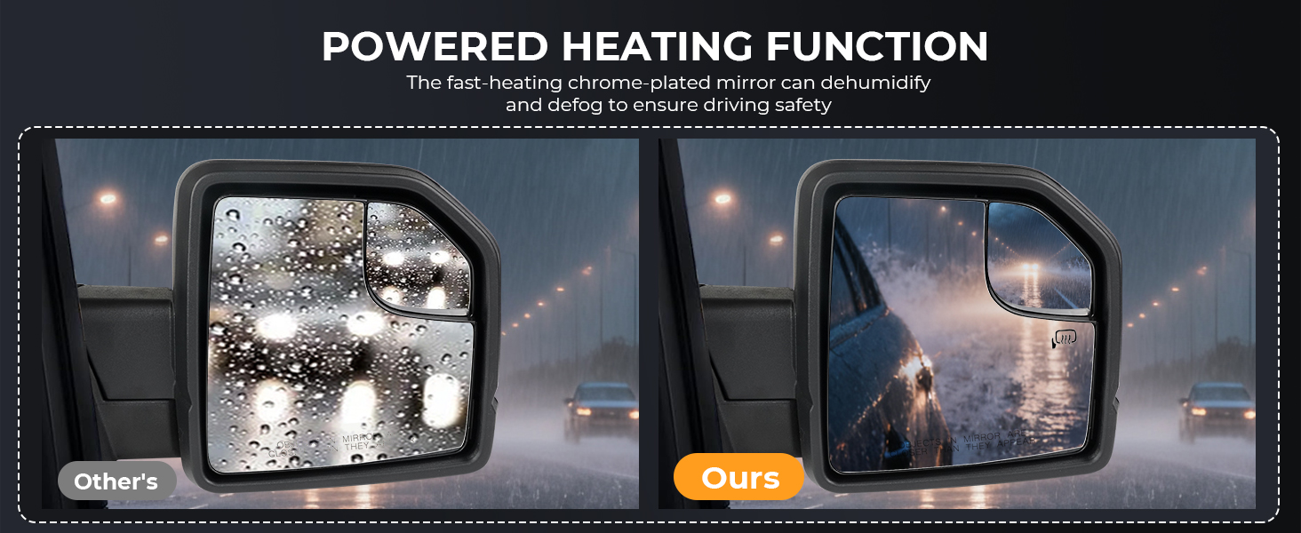 [Powered Heating Glass] Equipped with a built-in heating element, the mirror glass can quickly clear fog, frost, or light snow on the surface in cold, foggy, or rainy weather. It only takes a short time to restore a clear view, effectively avoiding risks caused by blurred rearview in bad weather.