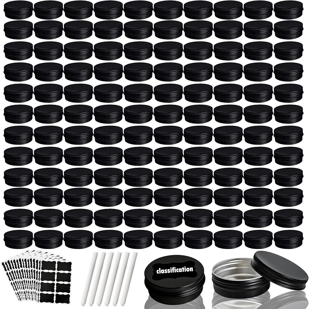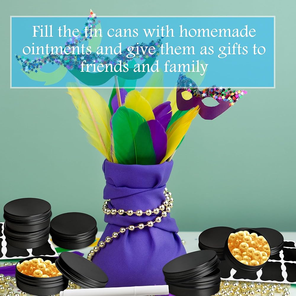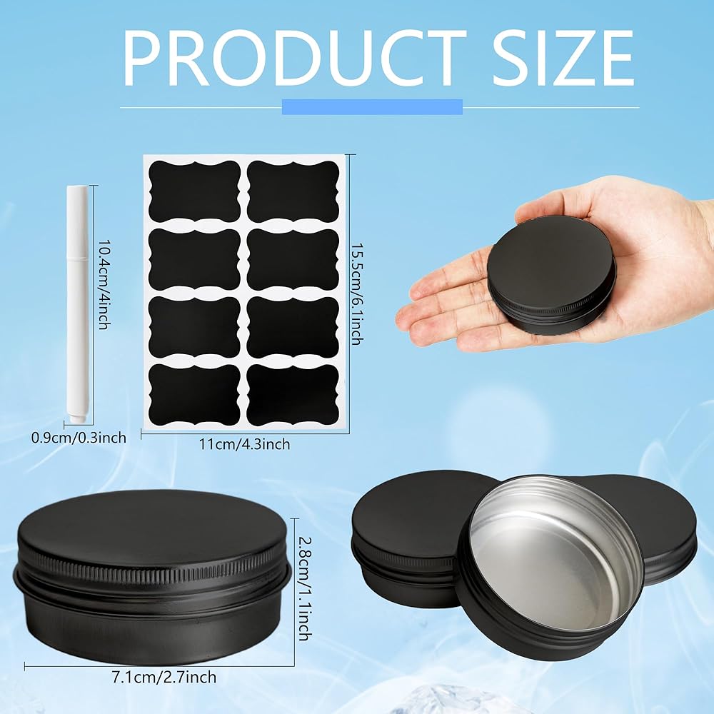 ✅Size Detail: Each aluminum jar measures approx. 2.8 x 1.1 inch/ 7.1 x 2.8 cm with a 2 oz/ 60 ml capacity, markers 4 inch/ 10.4 cm, stickers 4.3 x 6 inch/ 11 x 15.5 cm, making these round tins with lids perfect for compact storage and easy carrying in pockets, handbags, or travel kits and easy to make