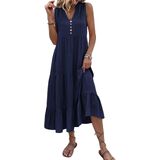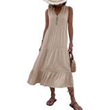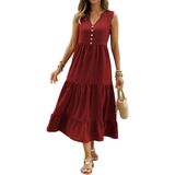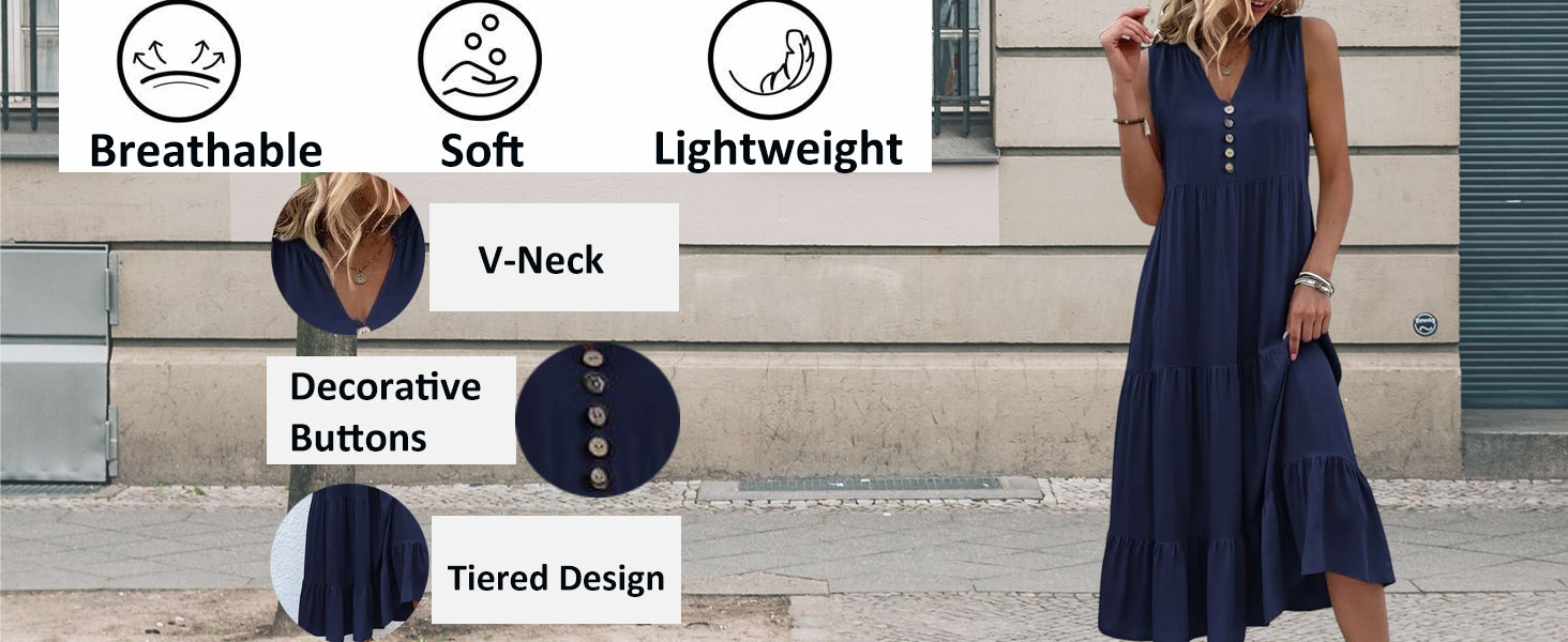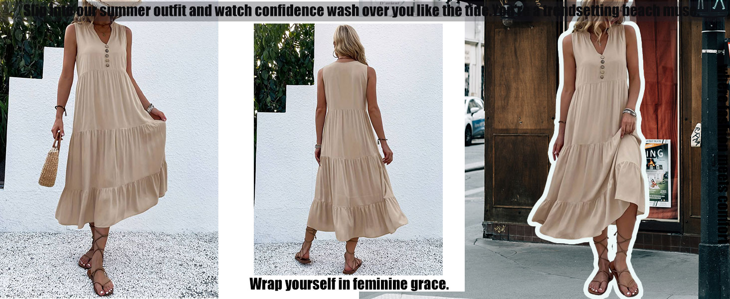 Feature : This flowy summer dresses features a flattering V - neckline adorned with a row of decorative buttons that add a touch of charm. The tiered design creates a flowing and feminine silhouette, with the ruffled hems on each tier enhancing its soft and stylish look. The midi - length gives it a versatile appeal