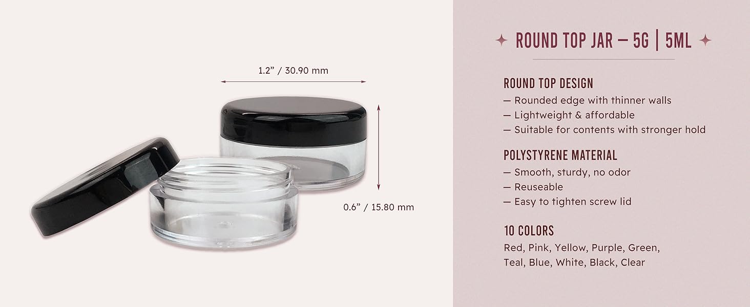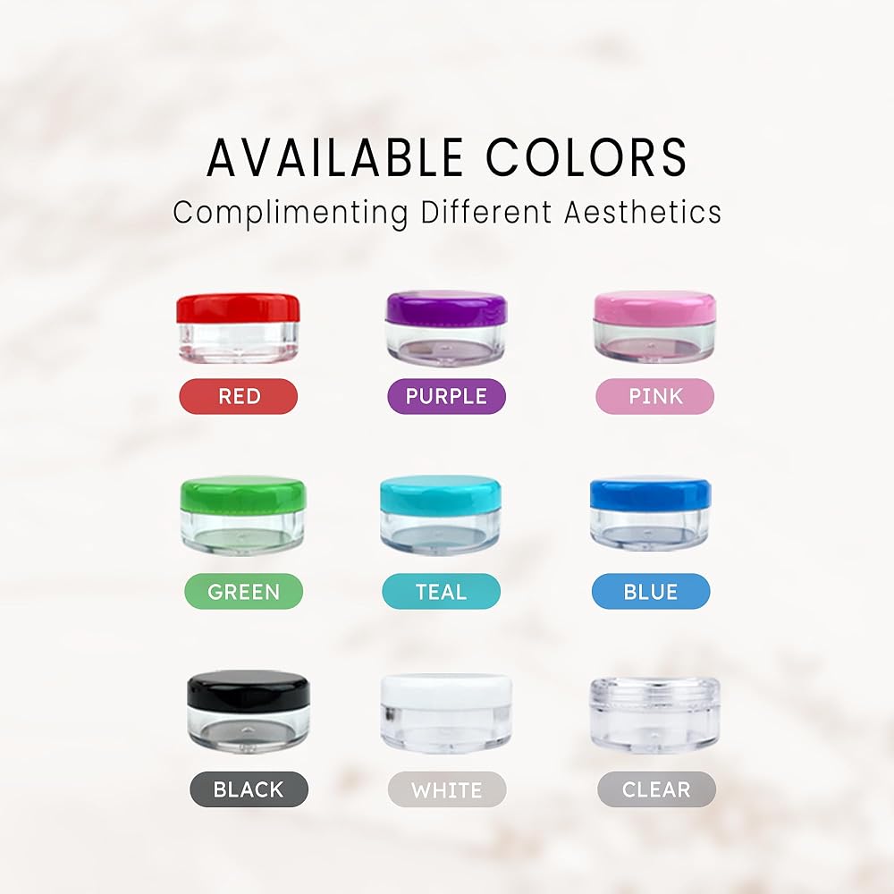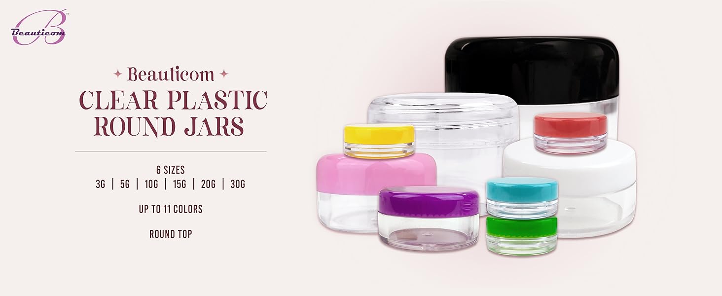 Beauticom 5g and 5mL sample jars with colorful lids are made of high grade plastic and PP, ABS. Round jars are corrosion-resistant. Durable and beautiful to use, non-toxic and environmental protection. Easy to clean re-use and recycle. Due to the good sealing of these round jars it can isolate the secondary pollution of cosmetics. Suitable for everyone to use!