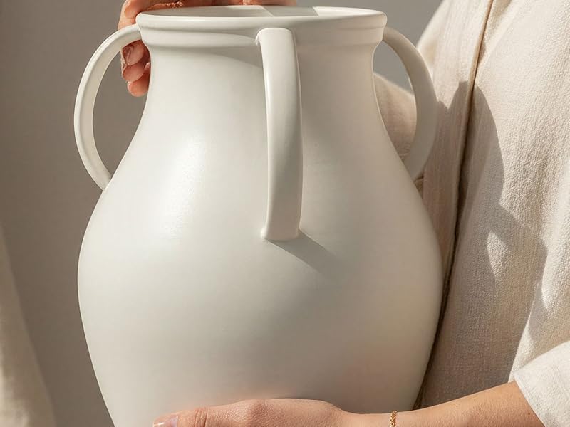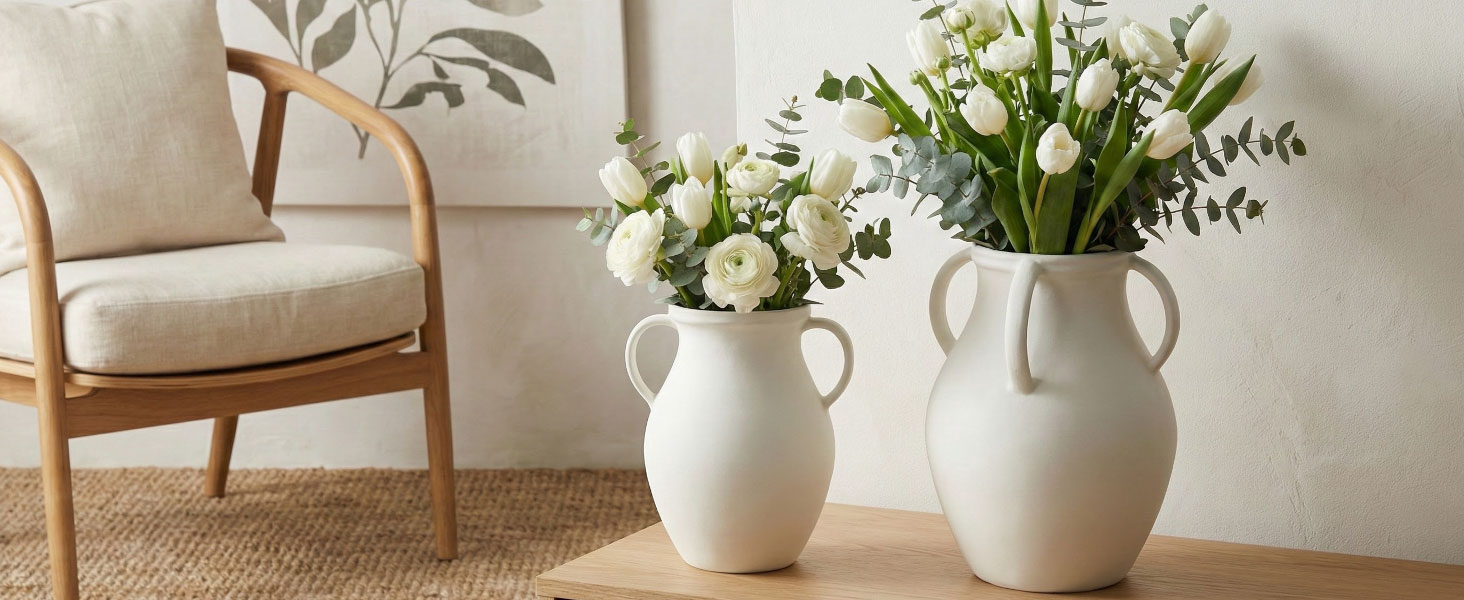 Matte White Jug Vase with Sturdy Handles -This farmhouse nordic style ceramic vase features a timeless bulbous body + durable side handles—its smooth matte white finish blends seamlessly with modern, rustic, or cozy home decor.