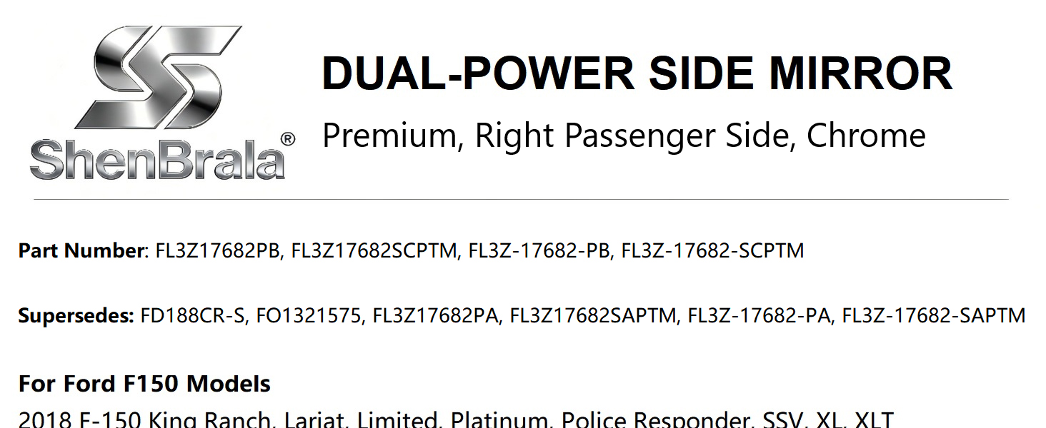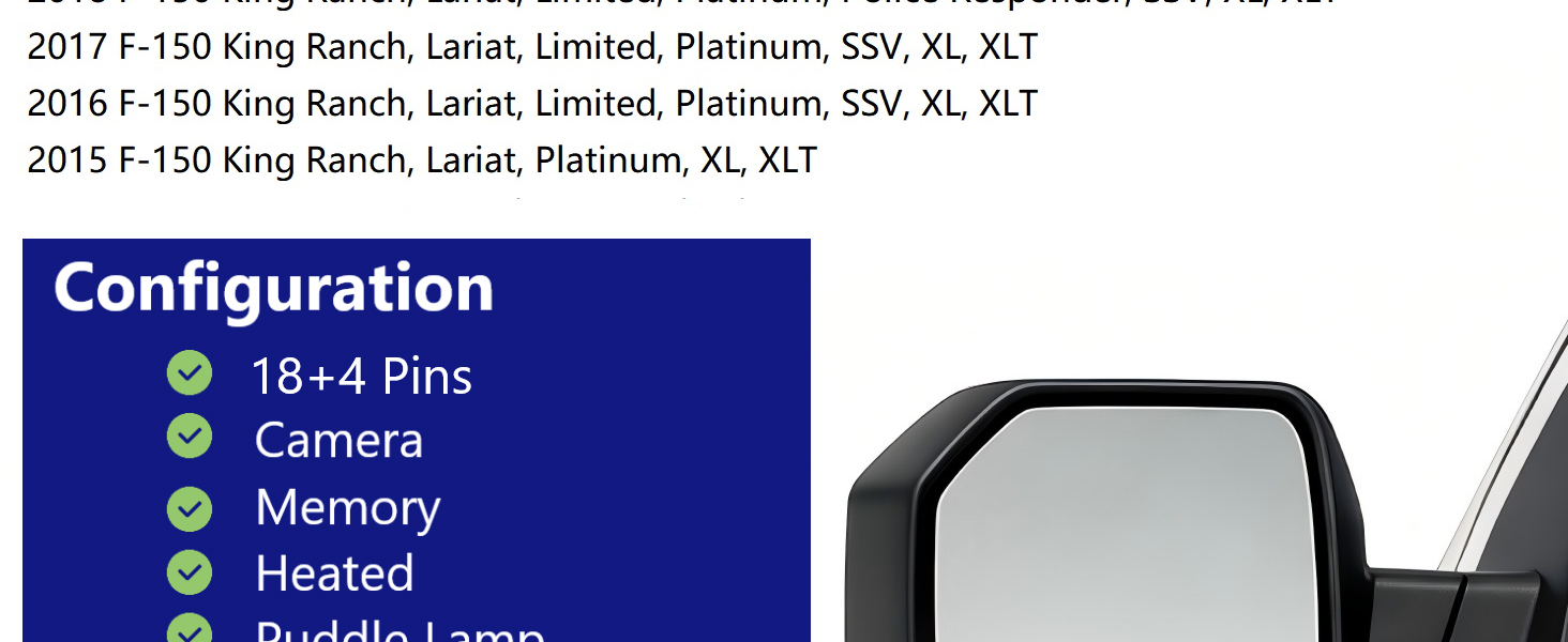 𝐅𝐢𝐭𝐦𝐞𝐧𝐭: High-spec miror assembly for Ford 2015-2018 F-150 Platinum, King Ranch, Lariat, XL, XLT; For 2016-2018 F150 Limited, SSV and 2018 F150 Police Responder