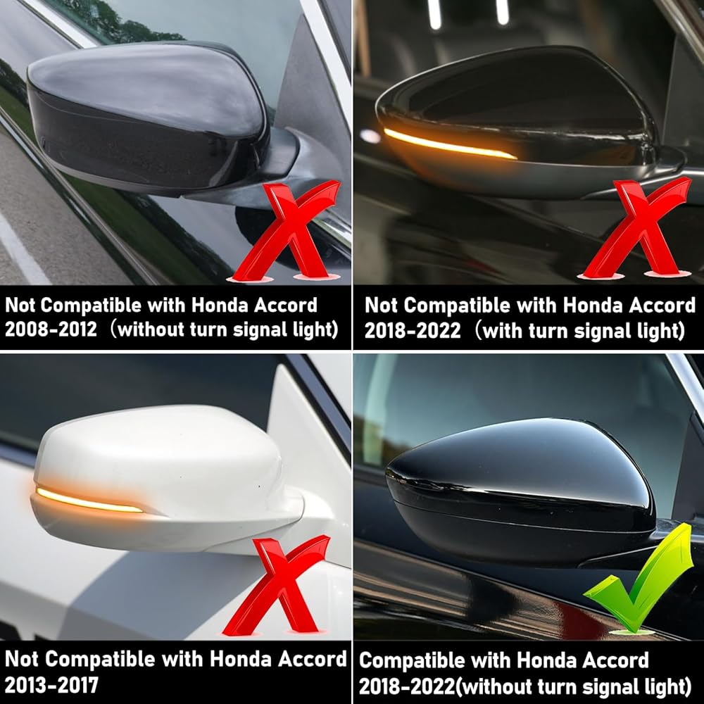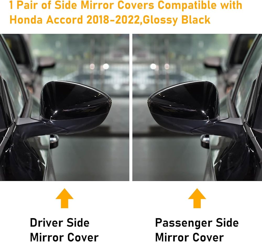 【High-quality Material】Abodvu Compatible with Honda Accord 2018 2019 2020 2021 2022 mirror skull caps replacement(10th Gen)made of premium ABS material.Fits perfect match's with the Original car's the glossy black paint.If you don't make sure that these are compatible with your Accord side mirrors,please tell us.We'd like to address any issues or concerns you have.There are 2 different mirror covers for 2018-2022 Accord.Side mirror covers just fit for side mirror without turn signal notch.