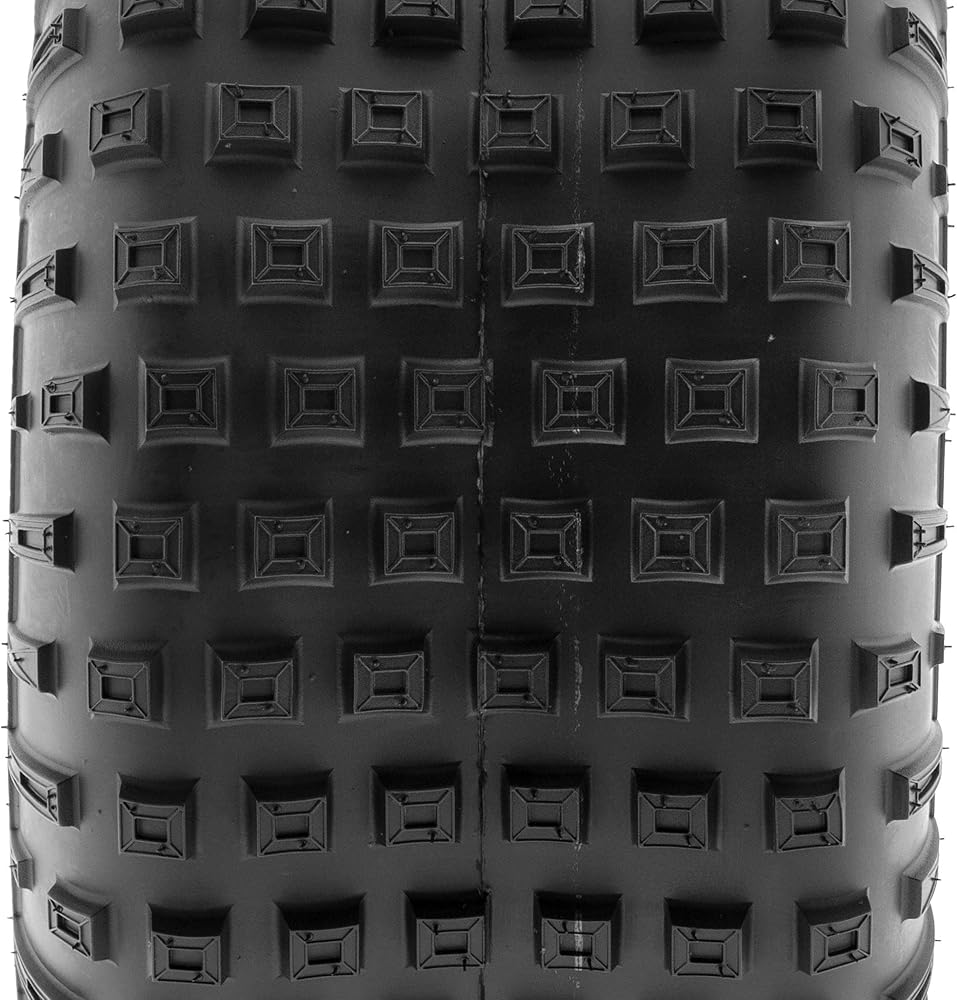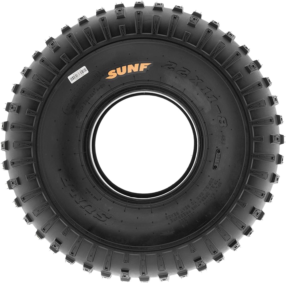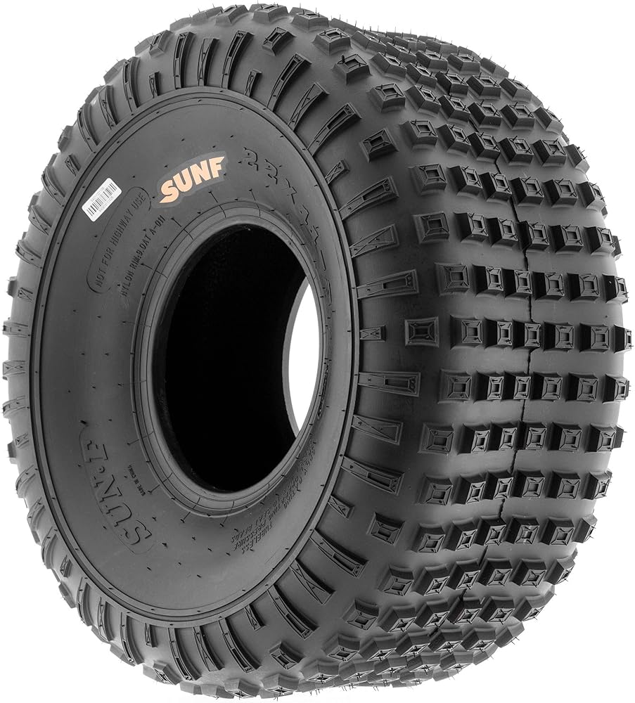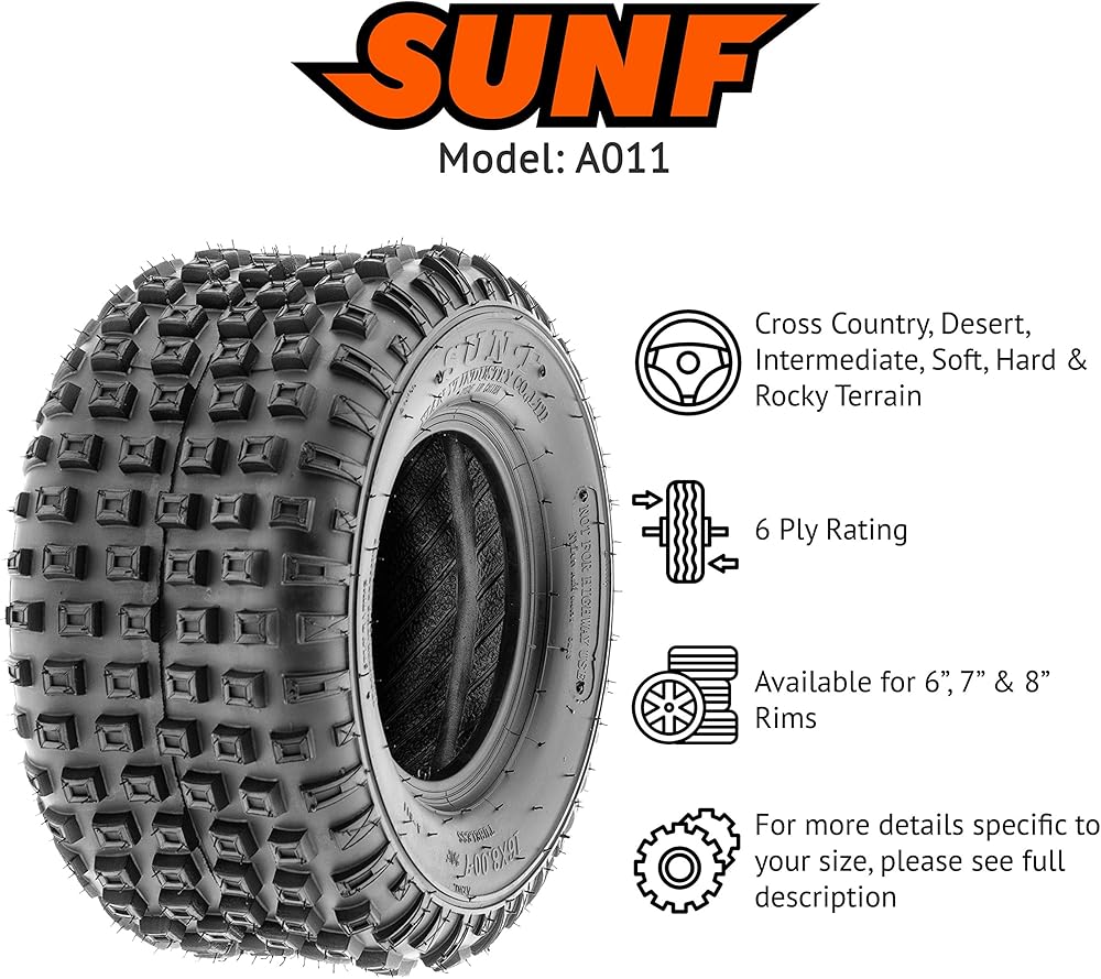 SunF Corporation has dedicated themselves to meeting their customer's demands and needs. SunF develops and manufactures a wide variety of quality tires in the specialty market. Their line up includes ST trailer, lawn and garden, agriculture, golf cart, ATV Quad Motorcycle, UTV Side by Side, light truck & more!The SUNF A011 ATV tire is equipped with a distinctive non-directional "grid dimple" tread pattern, optimizing all-terrain performance with exceptional traction and stability.All-Terrain Capability: Engineered to excel across diverse terrains, including mud, sand, and rocky surfaces, the A011 tire delivers reliable and consistent performance for off-road enthusiasts seeking versatile traction.Robust 6 Ply Construction: Crafted with a sturdy 6-ply construction, the A011 tire offers durability, effectively resisting punctures, cuts, and impacts to tackle rugged off-road conditions with resilience.Shoulder Traction Enhancement: Featuring advanced shoulder traction technology, the A011 tire ensures superior grip during turns and challenging maneuvers on various terrains, enhancing off-road confidence.Extensive Size Range: Available in sizes ranging from 13 to 25 inches, the SUNF A011 tire accommodates a wide range of ATV models and rider preferences, ensuring a customized fit for various vehicle setups and demands.Size 1: 25x12-9