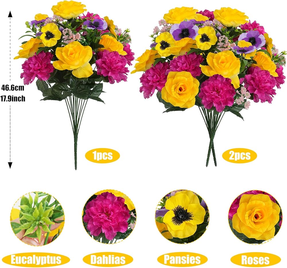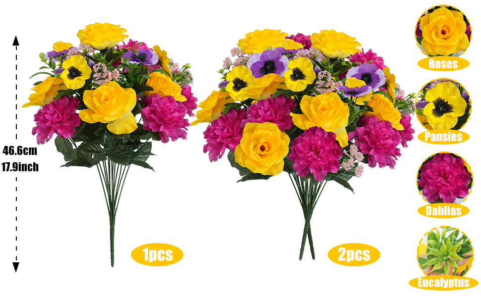 This spring cemetery flowers features rose, dahlias, pansies and eucalyptus leaves, lifelike silk floral arrangements are ideal for spring flowers home decor,also it is great for cemetery flowers outdoor
