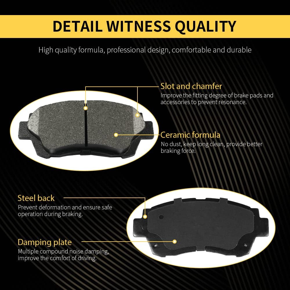 High performance ceramic:These brake pads are made of premium ceramic material, superior friction resistance, extreme heat tolerance, low dust, and quiet operation for a clean, smooth braking experience.