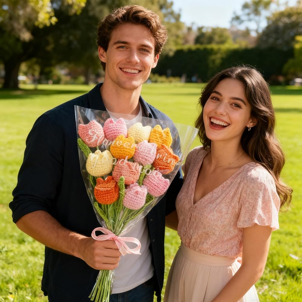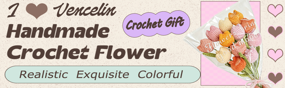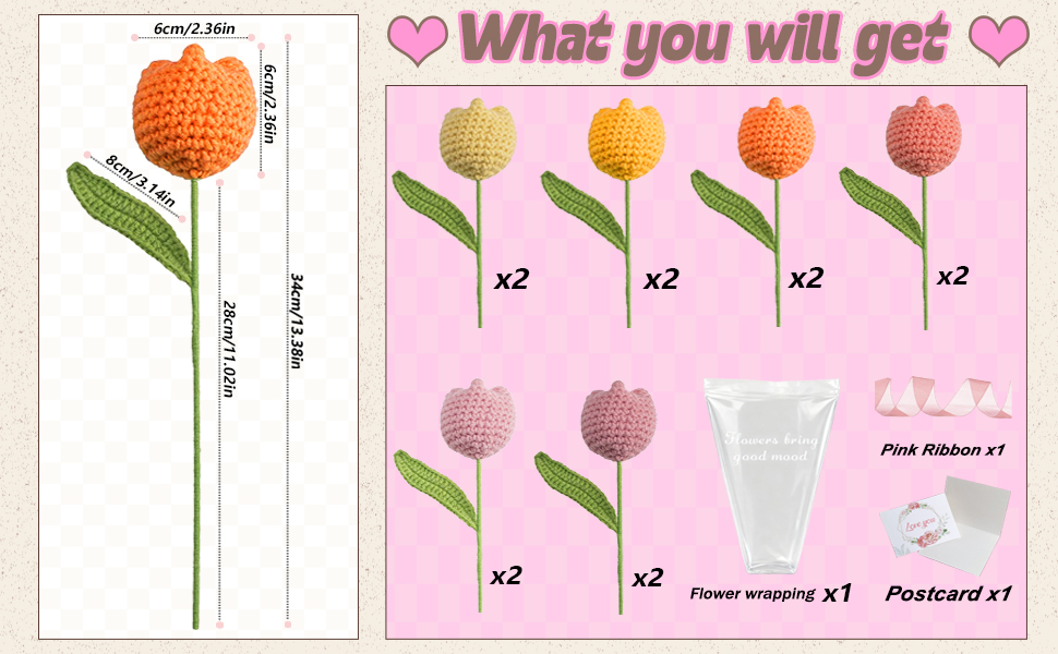 [Knitted Flower Set] -You will receive 12 hand-crochet tulips with a total length of 13.38in (34cm) and a flower size of 2.36in (6cm). There are 6 colors, with two tulips of each color. A good gift needs good packaging, so we have also prepared a bouquet packaging bag, greeting card, and a pink ribbon for you.