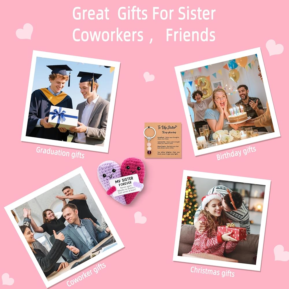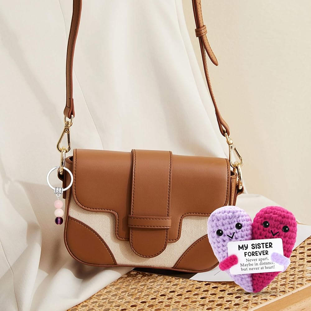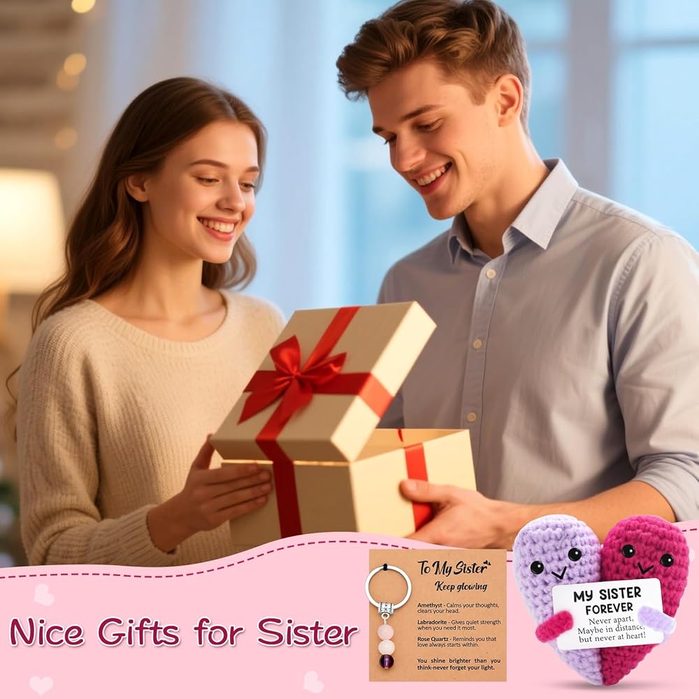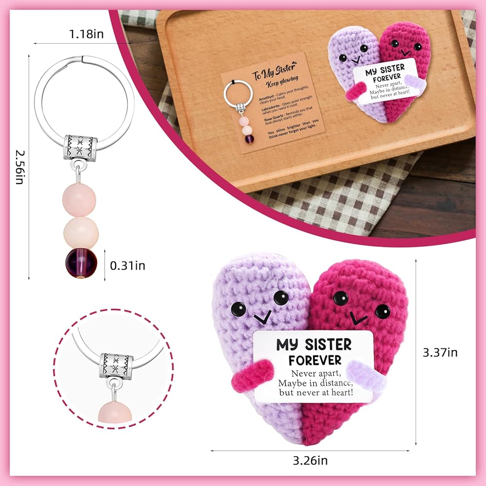 The sister birthday gifts box contains:A crochet love doll and a crystal keychain