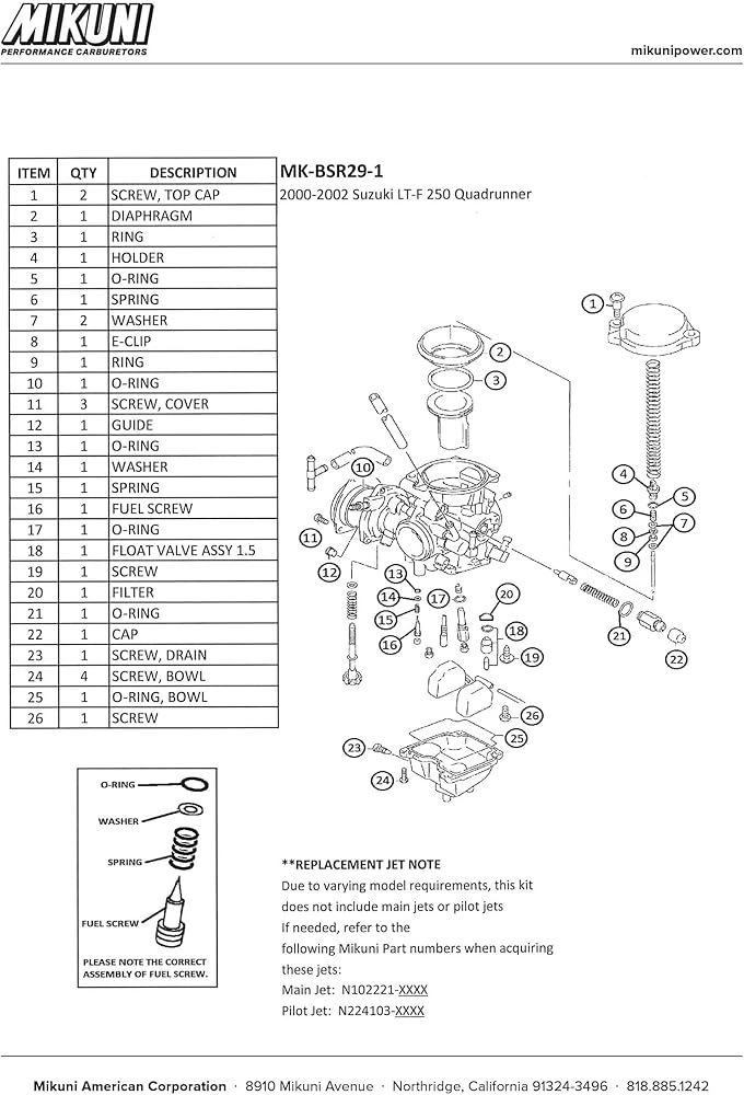 Genuine Mikuni Carburetor Rebuild Kits contain an assortment of critical parts which may include gaskets, diaphragms, seals, hardware and more. This kit contains parts needed to rebuild one Mikuni BSR Carburetor for Suzuki QuadRunner