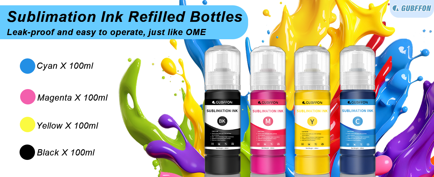 PACKAGE INCLUDE & EASY TO USE. 1x100ml black sublimation ink, 1x100ml cyan sublimation ink, 1x100ml magenta, 1x100ml yellow sublimation ink, This package makes it simple and easy to refill, eco-friendly.