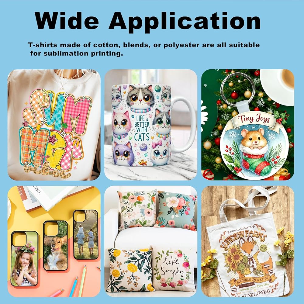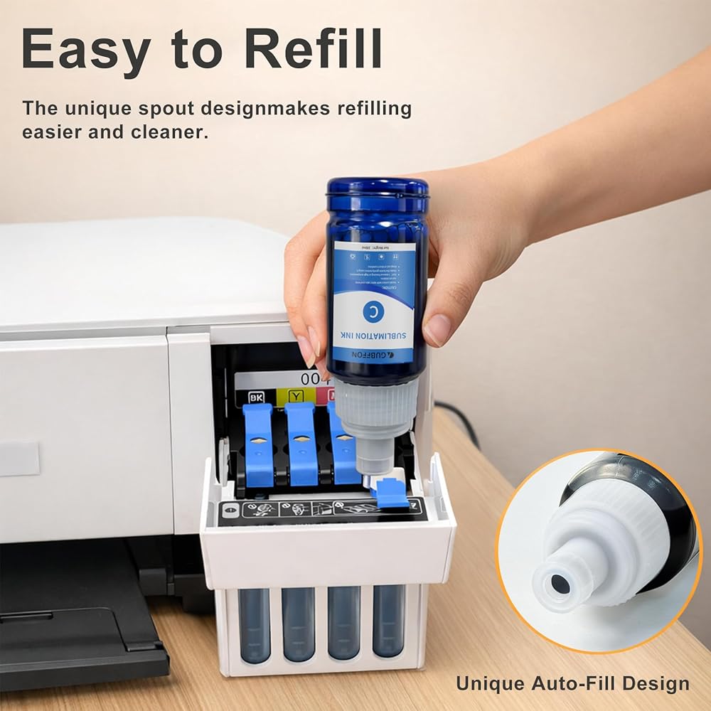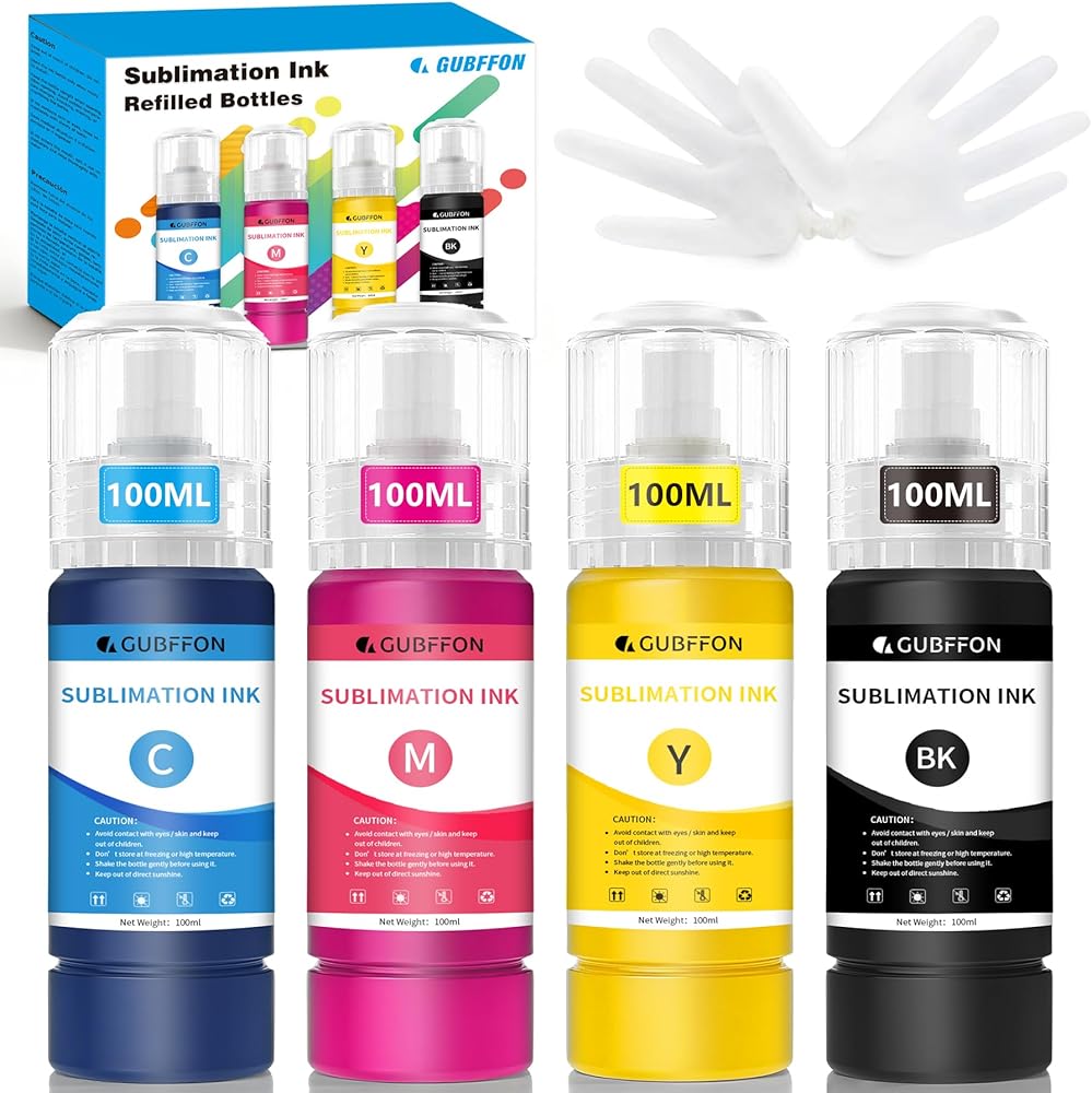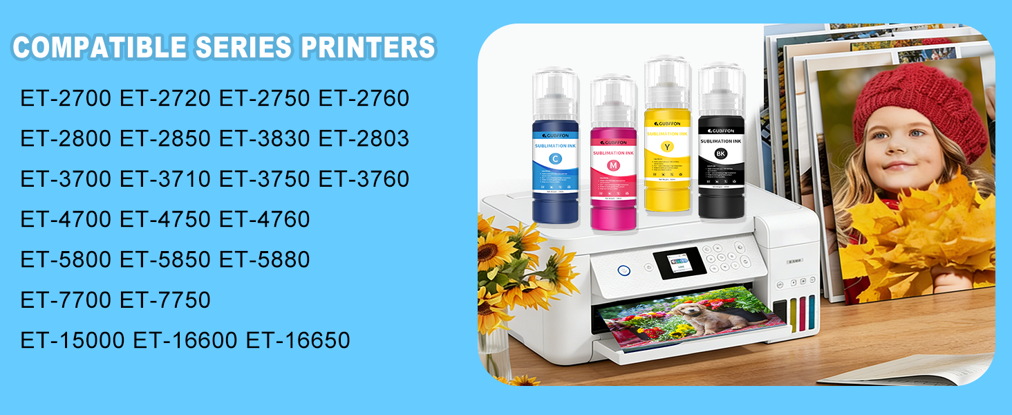 COMPATIBLE PRINTERS & CUSTOM DIY PRINTING. Gubffon sublimation ink for ET-2720 ET-2760 ET-2800 ET-2803 ET-2830 ET-2850 ET-15000 ET-3760 ET-4800 ET-4700 ET-3830 ET-3850 ET-8550 ET-2710 ET-3710 ET-4760 ET-16600 ET-16650 printer; WorkForce WF3620 WF3640 WF7620 WF3540 WF3520 WF7010 WF7110 WF7210 WF7510 WF7520 WF7610 WF7710 WF7720 printer ect. The sublimation ink is ideal for mugs, T-shirts, cloth, pillowcases, shoes, caps, ceramics, boxes, bags, quilts, cross-stitched items, decorative clothes, flags, banners, etc.(Note:Sublimation ink can only be used in fabrics containing less than 30% cotton)