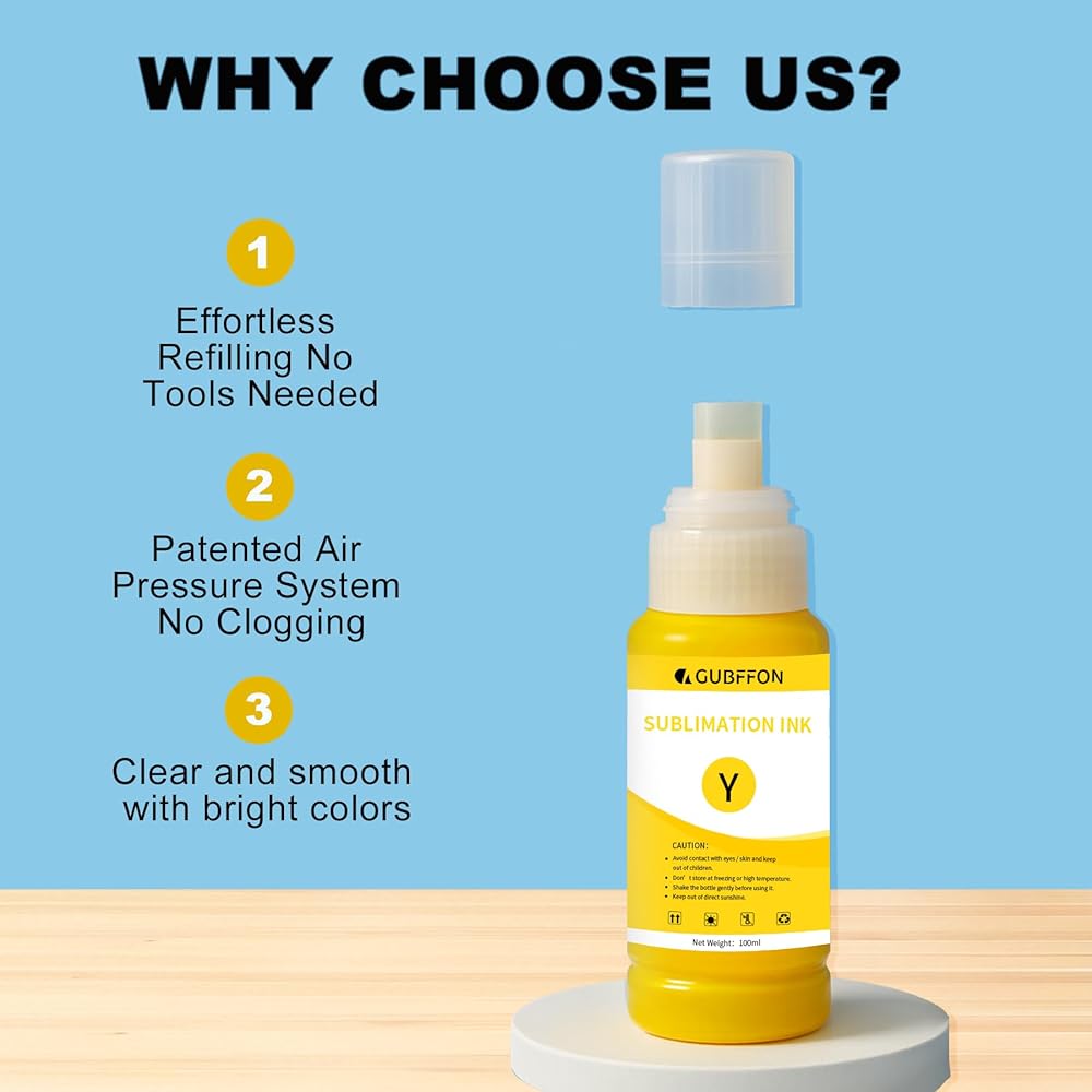 VIBRANT COLOR. Gubffon water-based dye sublimation ink has the finest texture and gradient for a smooth even coat of inks every time that will last as well as be wonderfully vivid. This ensures no printhead clogs with a stronger color reduction to offer intense and vibrant color images.