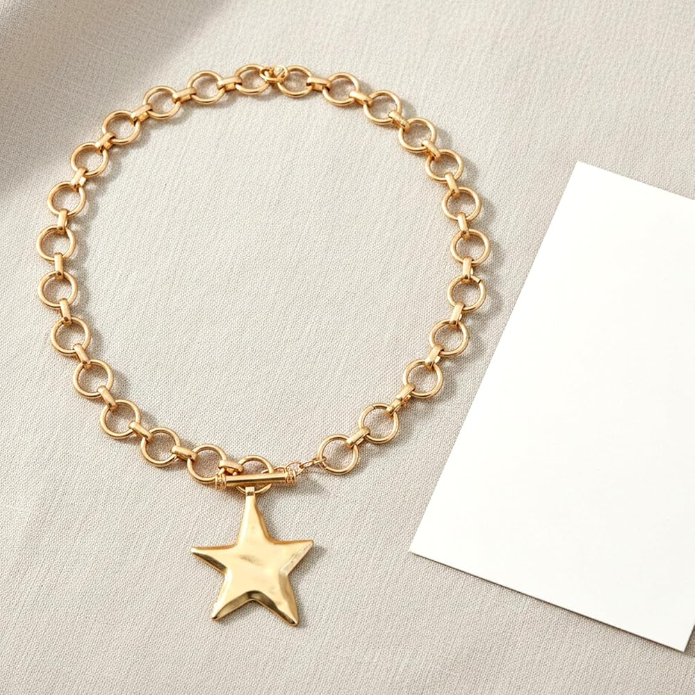 【Premium Material】 Crafted from stainless steel with a gold plating, this gold star necklace resists tarnishing, maintaining its appearance over time. The chunky necklace is built to withstand daily wear, and the star necklace pendant is securely attached to prevent damage. This chunky star necklace offers reliability and long-lasting shine, making it a practical choice for frequent use. The bold, chunky chain contrasts beautifully with the delicate star shape, creating a confident yet romantic silhouette.