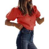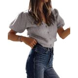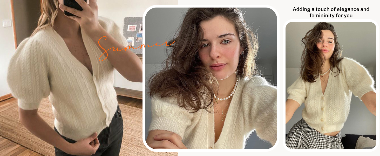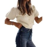 This knit cardi is featured in a cropped style with puffed short sleeves and button-front closure