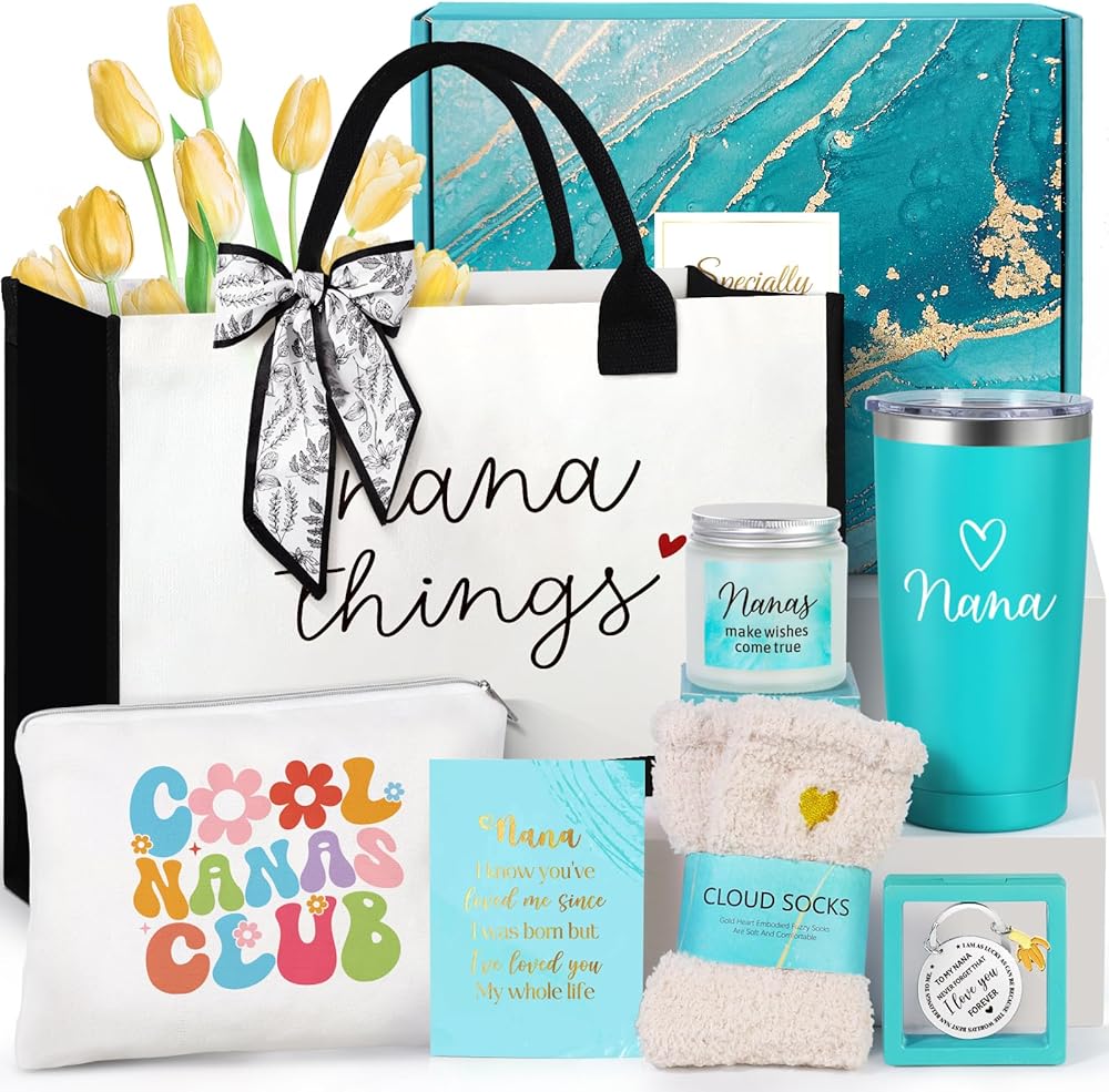 A HEARTWARMING GIFT FOR YOUR NANA: This high-quality 304 stainless steel thermos keeps her drinks hot for 4 hours or cold for 12. The adorable charm keychain, engraved with "Nana, I Love You" serves as a sweet reminder of your love and appreciation. Ultra-soft microfiber socks will keep her feet cozy from morning to night—because nana deserves to be pampered every step of the way. Plus, the chic canvas makeup bag is perfect for organizing all her "Granny essentials."