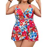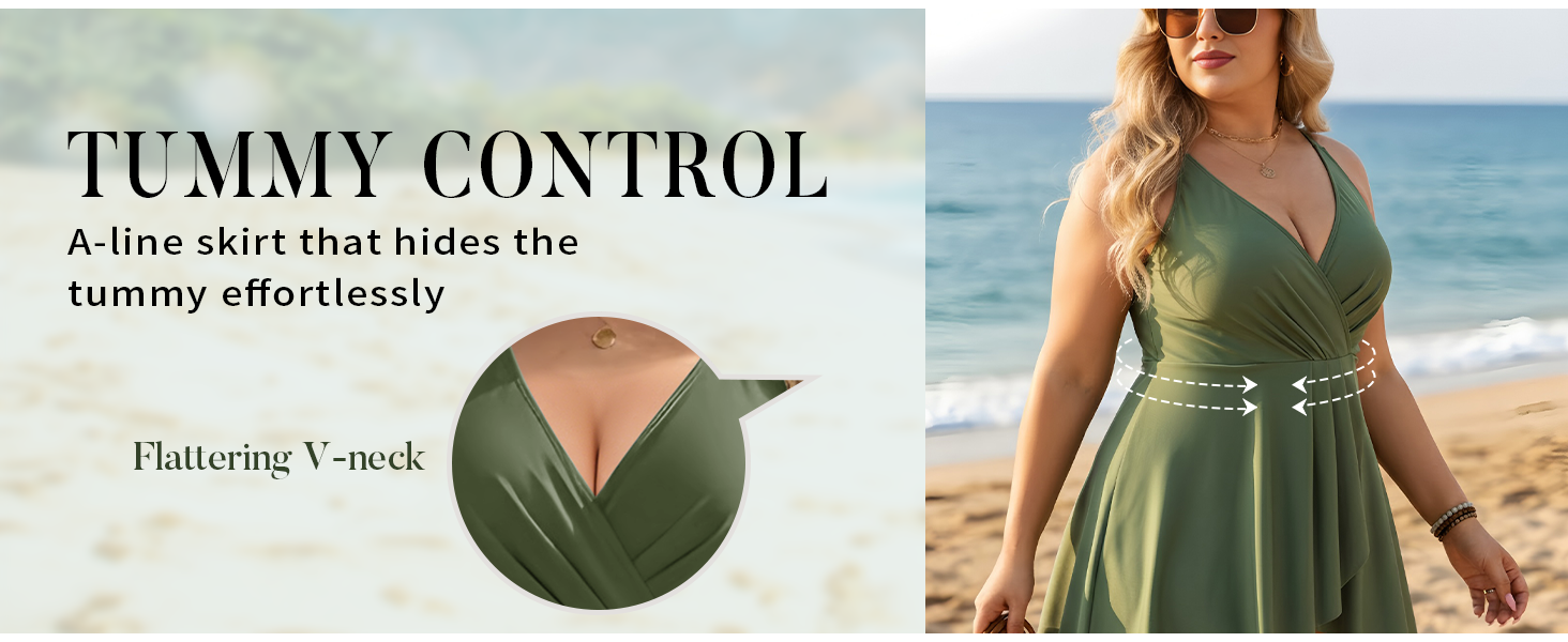 Flattering Tummy Control: This elegant swimdress features a flowing A-line skirt that effortlessly hides the midsection, while the ruched crossover V-neck design provides a slimming effect for all body types
