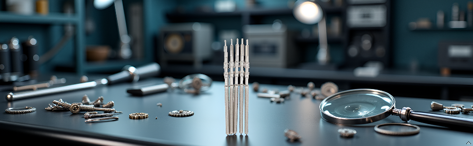- KIT CONTENTS: Set includes 5 pieces of premium silver steel crown stems for watch movement repair and maintenance